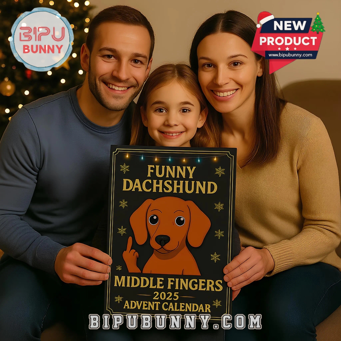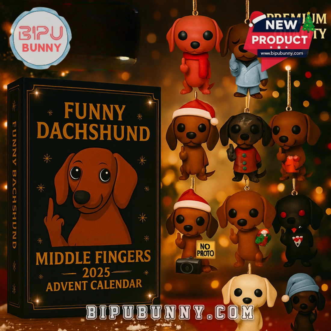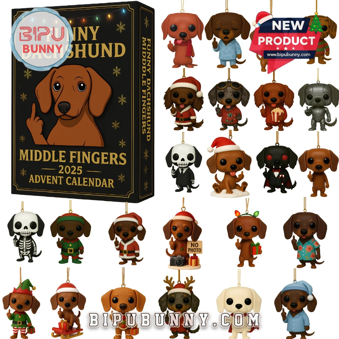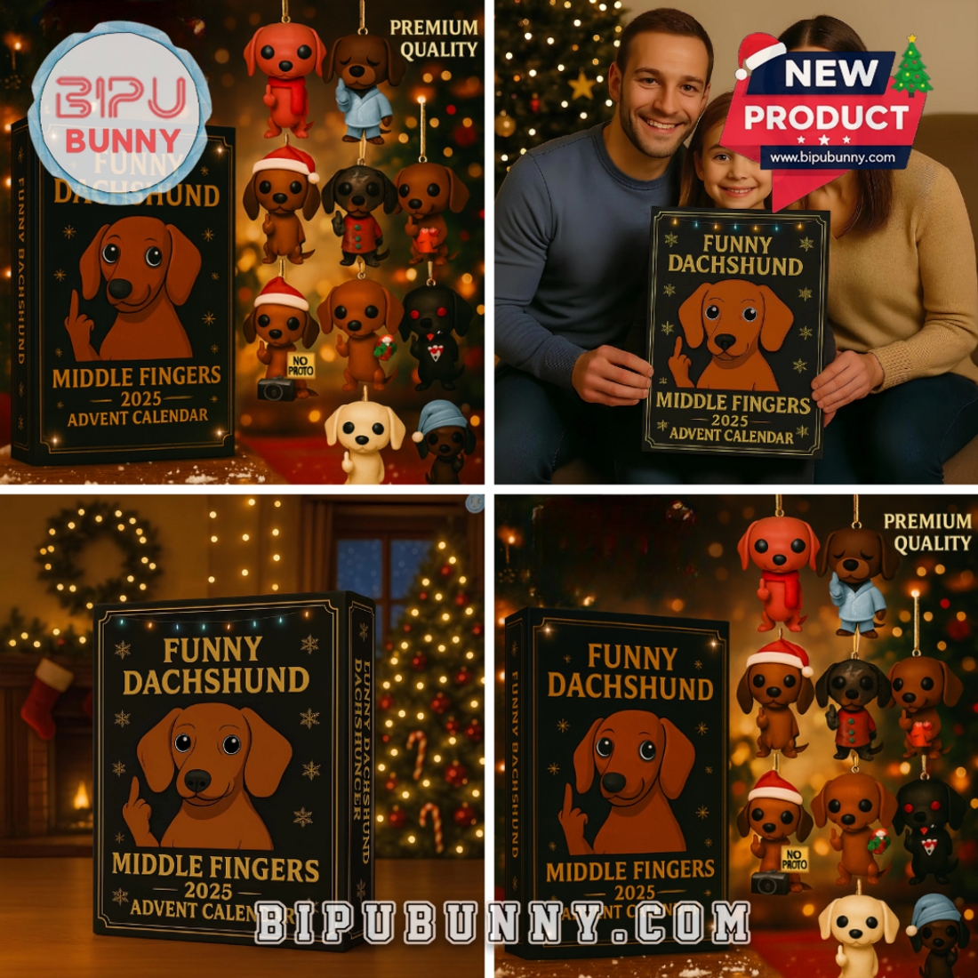 The 2025 Dachshund Advent Calendar is the perfect blend of festive cheer and playful humor, especially for dog lovers. This unique calendar features 24 adorable dachshund figures, each one carefully designed with a fun and humorous middle finger pose, adding a cheeky twist to your usual holiday countdown. Each door reveals a new dachshund figure dressed in a variety of holiday-themed outfits, such as Santa hats, Christmas sweaters, and even reindeer antlers.