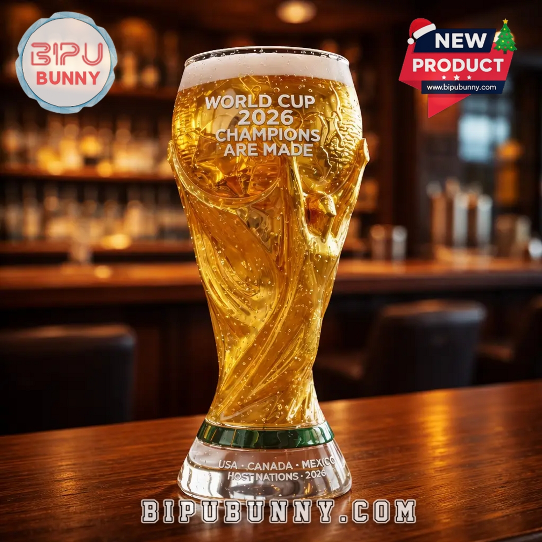 At the top, the rim is smooth and slightly flared for comfortable sipping, while the base is thick and stable, ensuring durability even after countless cheers and toasts. Some variations include transparent glass styles for those who prefer a more minimalist look, while others boast a gold-finished design that shines brilliantly under bar lighting. Each mug proudly bears the engraved text “World Cup 2026 Champions Are Made” – a reminder of the energy, dreams, and triumphs that the tournament inspires. Perfect for beer, cider, or even soft drinks, this mug combines style, symbolism, and usability in one elegant piece that fits any fan’s hand perfectly.