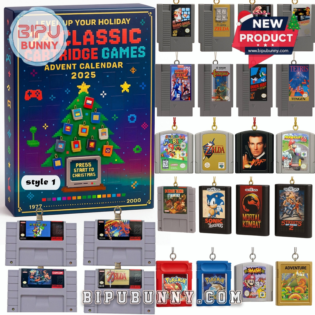 The 24 Classic Cartridge Game Advent Calendar 2025 is the perfect way to bring the spirit of retro gaming to your holiday celebrations. This vibrant and nostalgic calendar features a colorful design with a pixelated Christmas tree adorned with game cartridge ornaments, making it an eye-catching addition to any festive space. The calendar comes in two distinct styles, each celebrating iconic video games from the past, including fan favorites like Super Mario, Zelda, Sonic, and Mortal Kombat. Each day, you’ll unveil a new retro game cartridge ornament, offering a delightful countdown to Christmas for any gamer. The calendar is made from high-quality, durable materials, ensuring that it can be used year after year.
