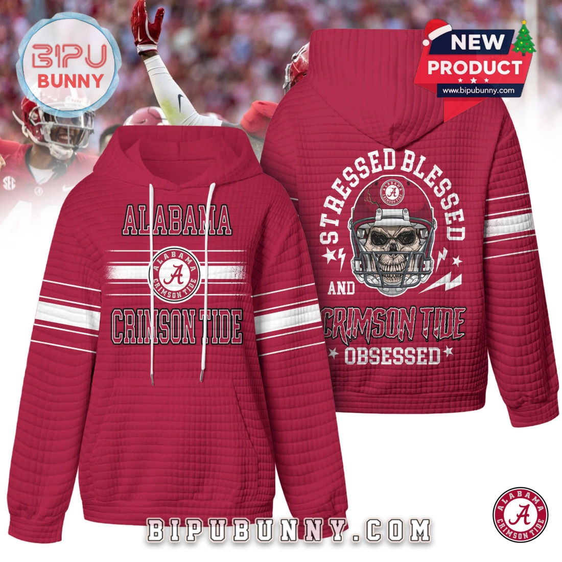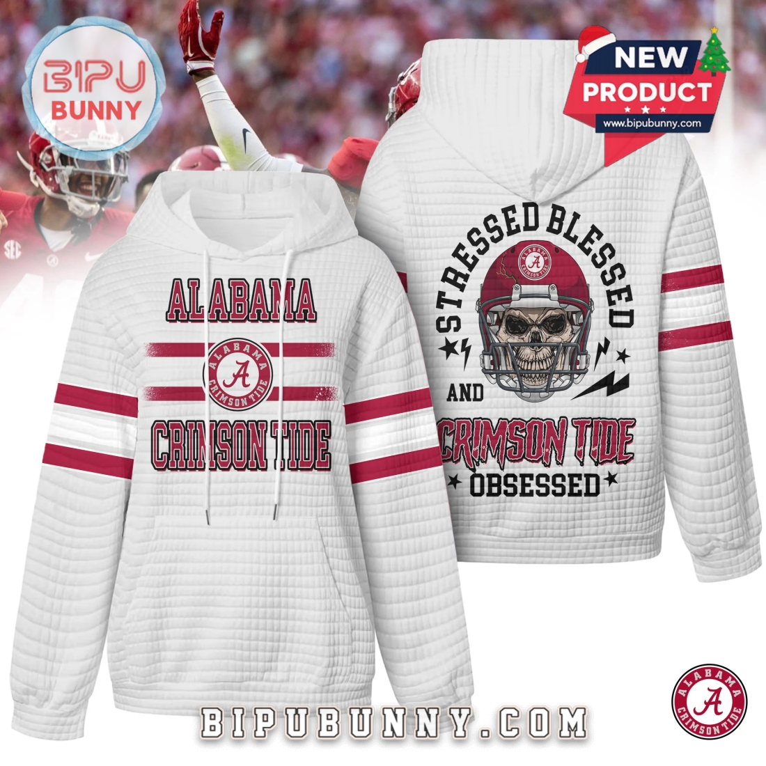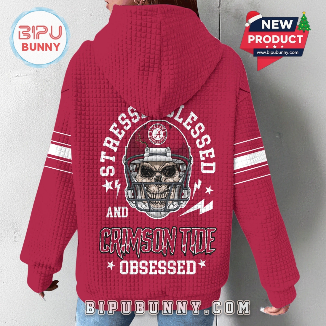 On the back, the hoodie features one of its most striking design elements. A detailed image of a skull wearing an Alabama football helmet sits in the center, surrounded by small star accents, lightning graphics, and the bold phrase Stressed Blessed and Crimson Tide Obsessed. The placement is large enough to stand out without overwhelming the overall look. Each hoodie also includes adjustable white drawstrings, a spacious kangaroo pocket, ribbed cuffs, and a soft inner lining. The fabric is a durable poly cotton blend that resists shrinking while staying comfortable throughout the day. The crimson version delivers the classic Alabama spirit, the black option adds a sleek modern feel, and the white design brings a bright, clean twist to traditional fan gear.