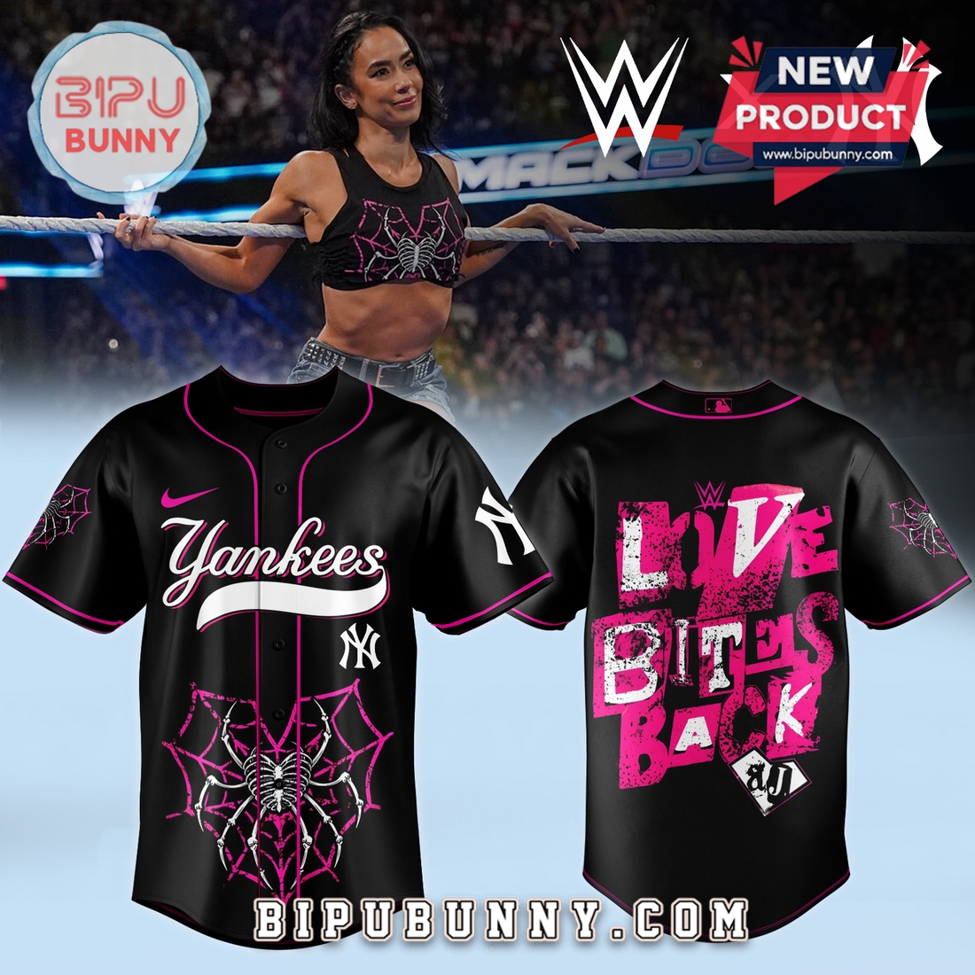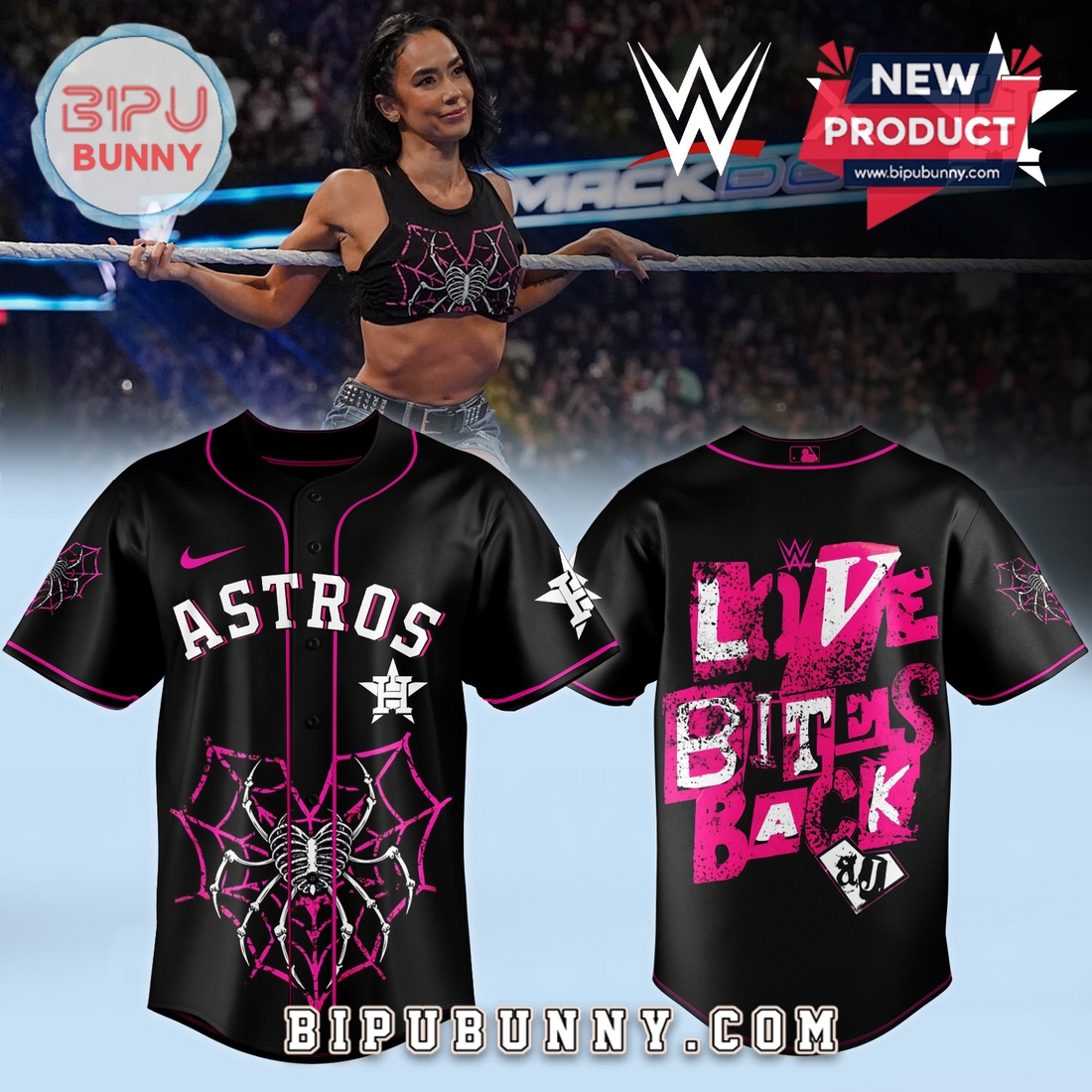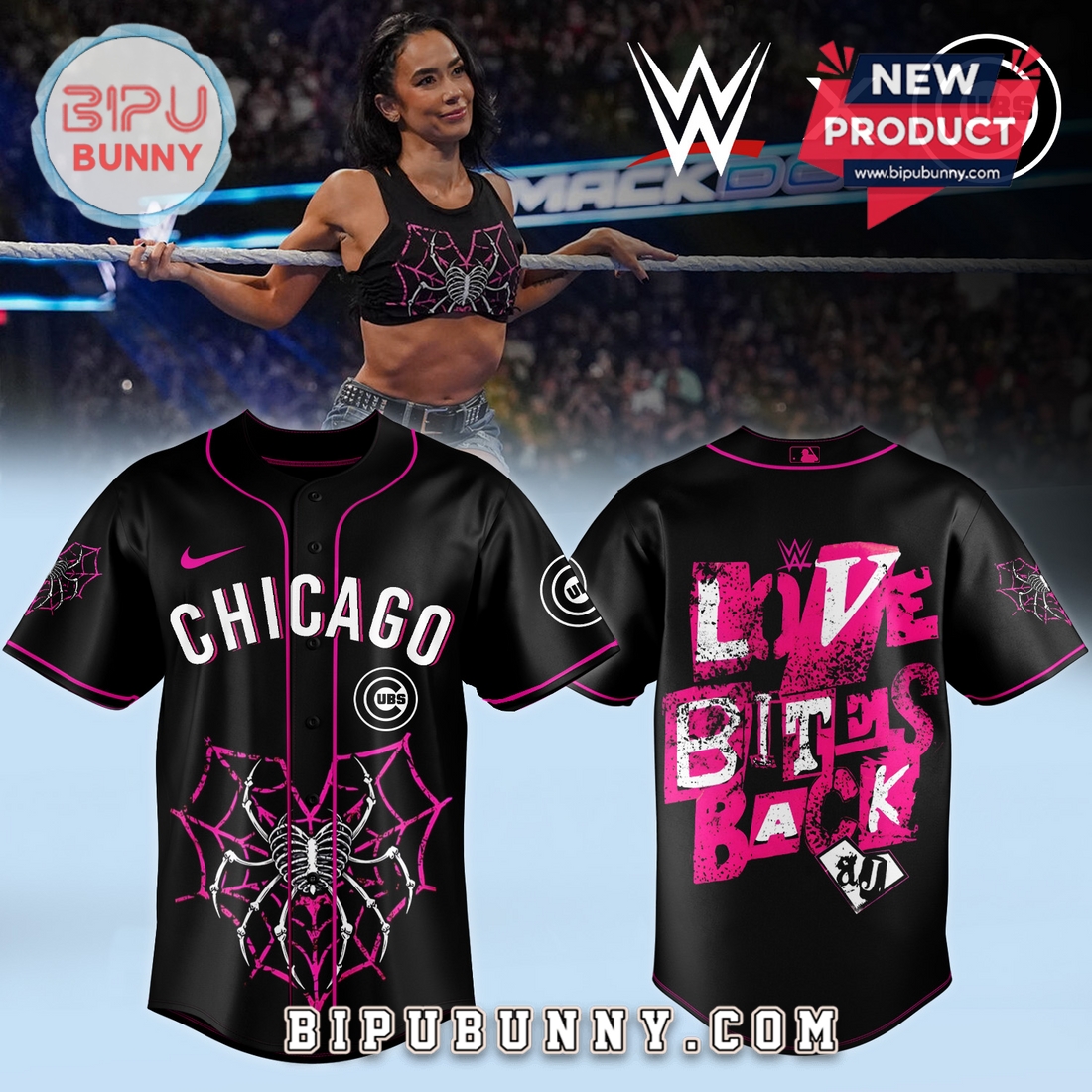 The All Team MLB X AJ Lee Has Returned WWE Baseball Jersey is a unique, limited-edition piece that merges the worlds of MLB and WWE, created for fans who love both sports and wrestling. The jersey features a striking black base with vibrant pink accents, ensuring it stands out in any crowd. Each design is complemented by the phrase “LOVE BITES BACK” in bold pink text, accompanied by a spooky spider web pattern. The jersey is available with different team logos, including the Chicago Cubs, Houston Astros, New York Yankees, and Los Angeles Dodgers, allowing you to show off your favorite team while embracing AJ Lee’s iconic WWE persona. This jersey is made from premium, lightweight fabric, designed to keep you comfortable whether you’re at a game or out with friends. The detailed spider web and skeletal motifs give it a fresh, edgy twist, making it perfect for Halloween or any occasion that calls for bold, eye-catching fashion.