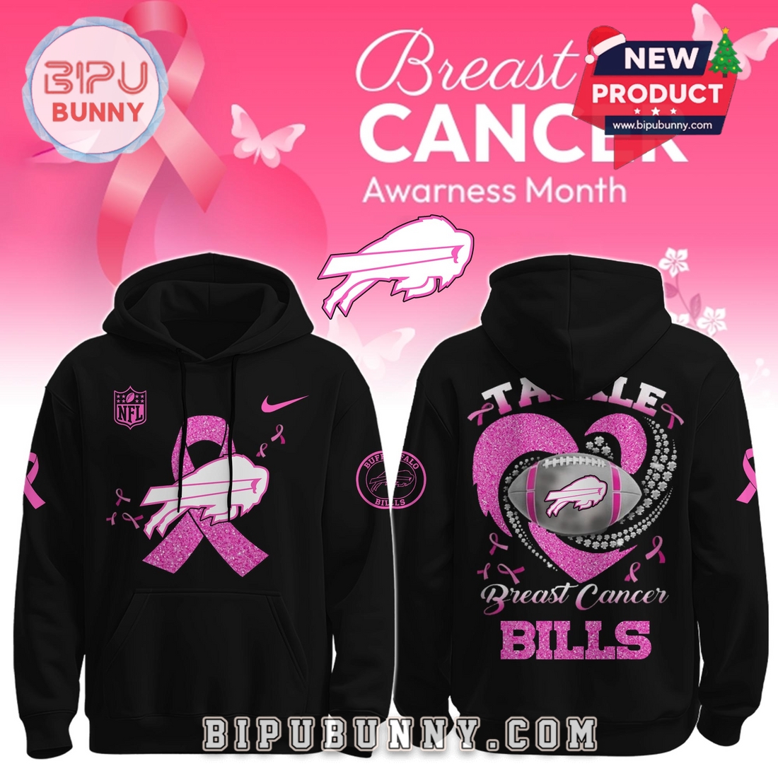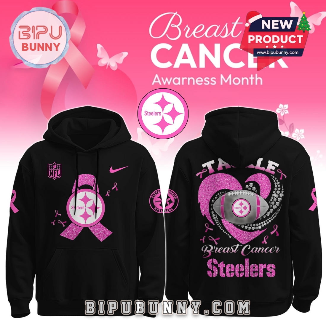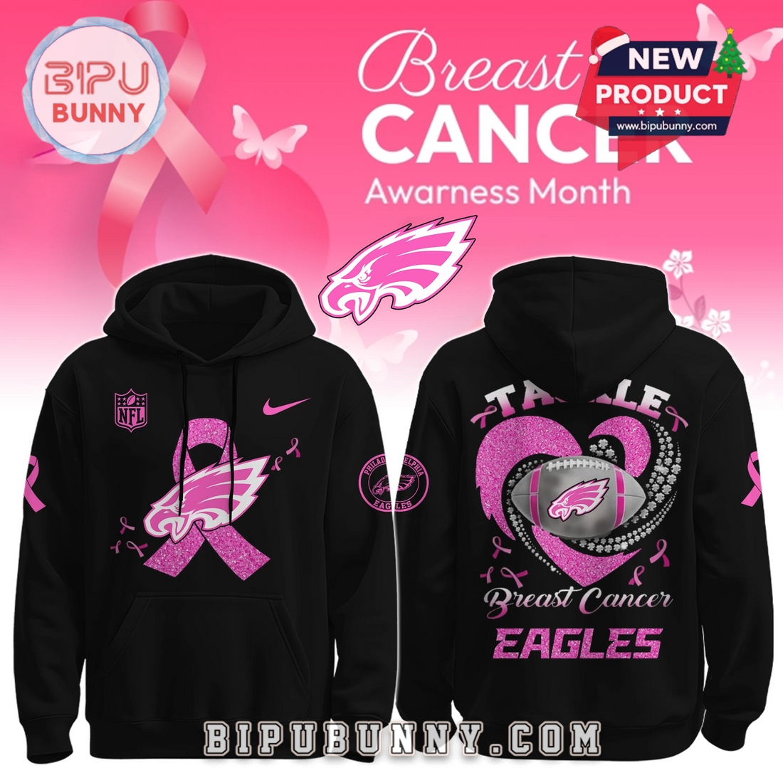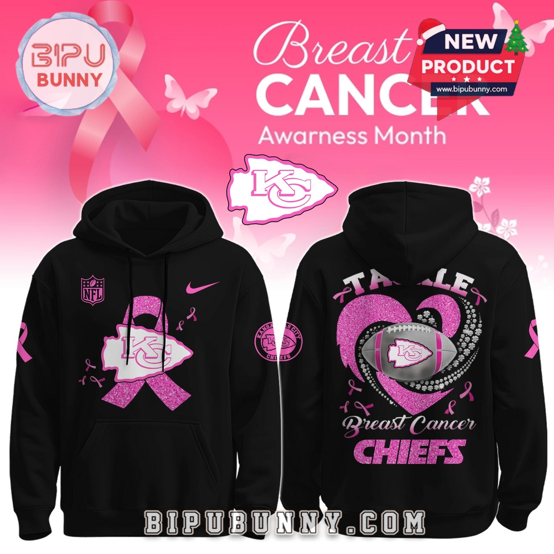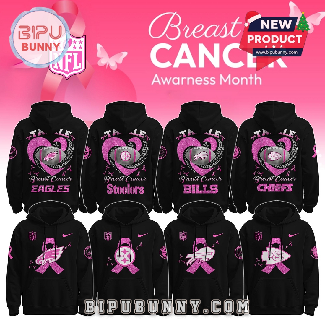 On the front, you’ll find a unique heart-shaped football graphic surrounded by pink ribbons, reflecting the “Tackle Breast Cancer” campaign. The back features the team name in bold lettering, creating a powerful statement of support. Small but significant details, such as the pink ribbon on the sleeve and the NFL logo, complete the design, ensuring that this hoodie is not just a piece of fan apparel but a statement of solidarity with those affected by breast cancer. This hoodie is available in designs representing various NFL teams, including the Philadelphia Eagles, Pittsburgh Steelers, Kansas City Chiefs, Buffalo Bills, and more, so fans can support both their team and this important cause.