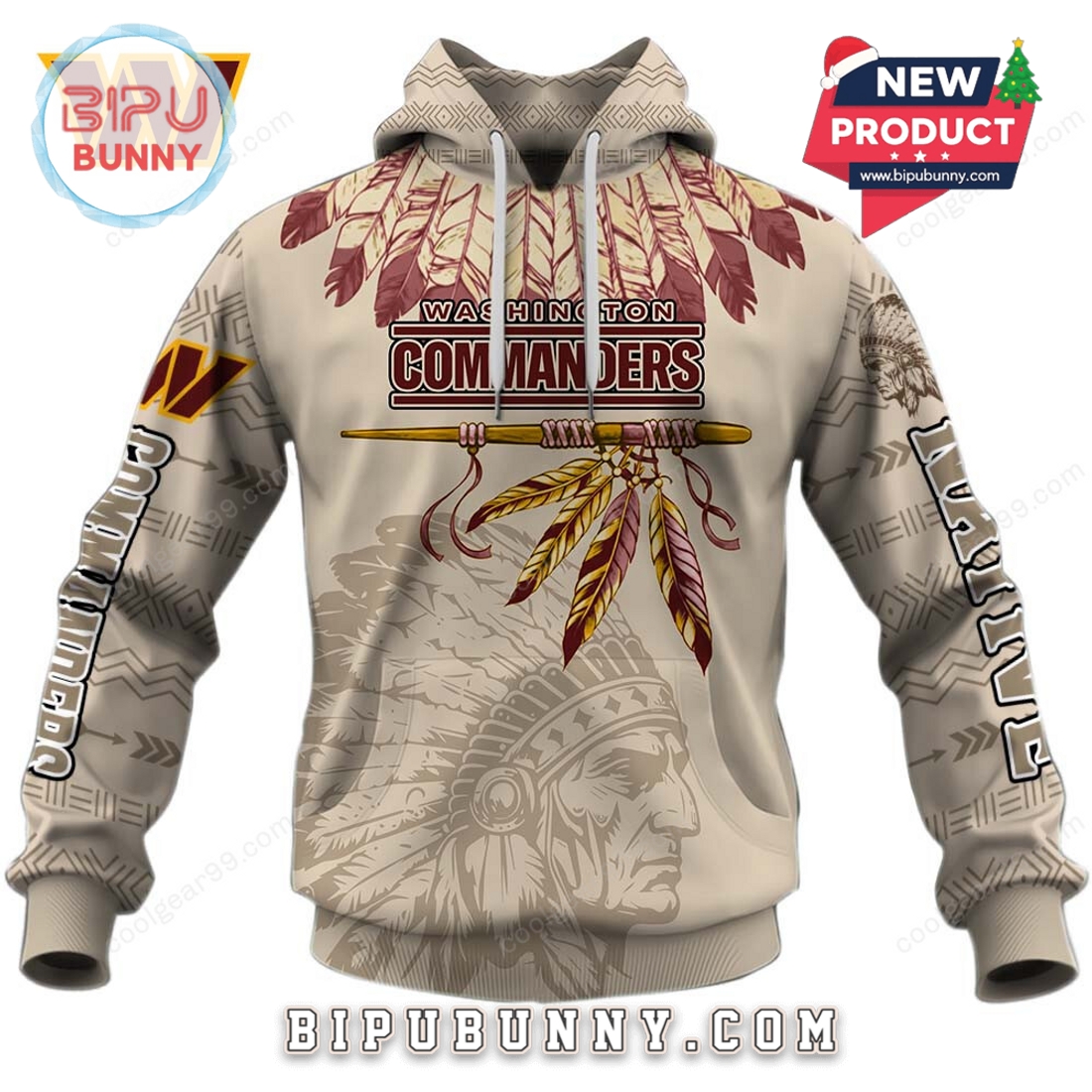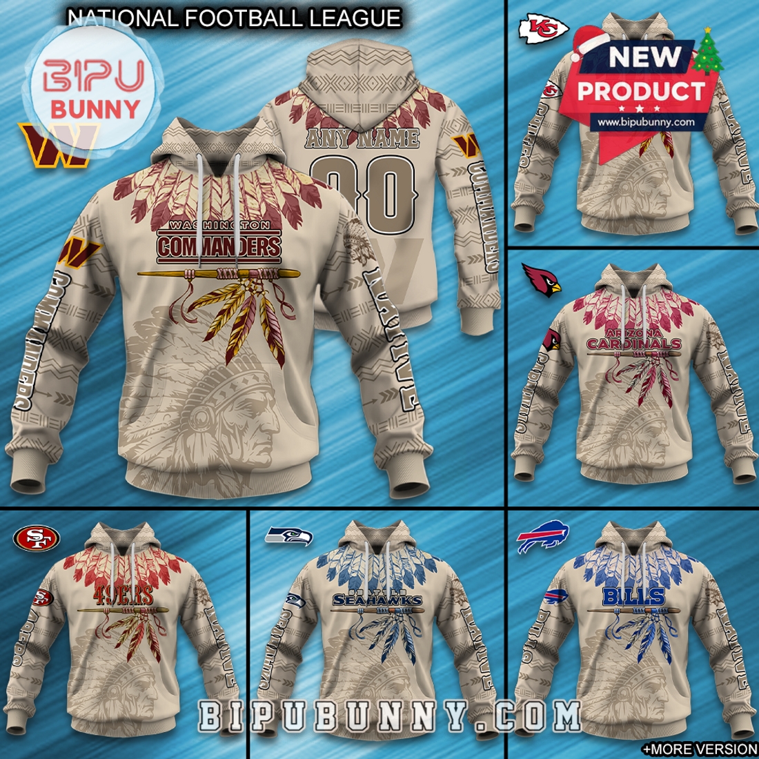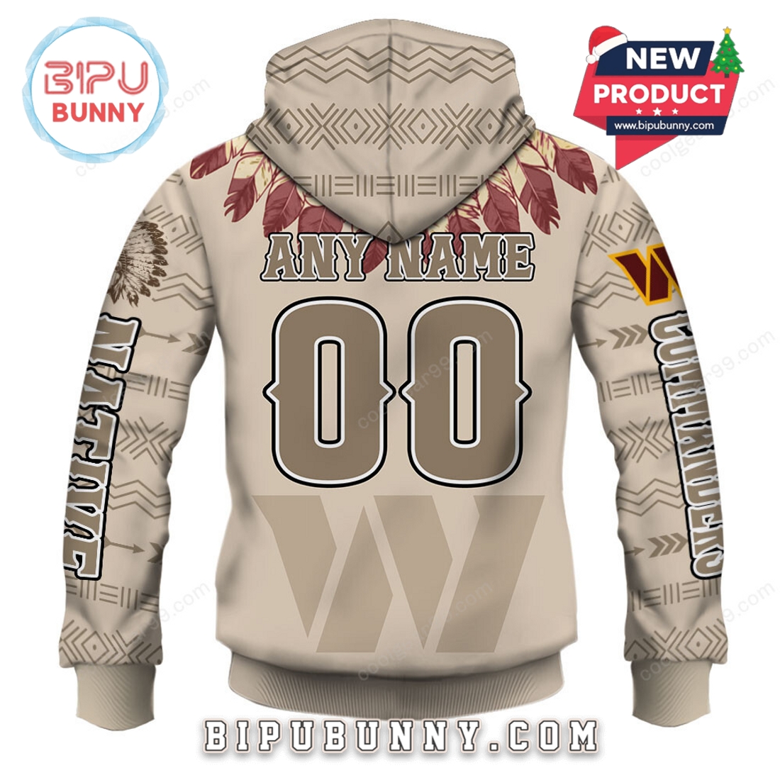 The All Team NFL Native American Heritage Hoodie is a bold and meaningful piece that blends football pride with cultural respect. Designed in a neutral tan base color, this hoodie features a striking layout with tribal feathers across the chest, traditional warrior profiles, and detailed geometric tribal patterns on the sleeves and hood. Each hoodie is customized for an official NFL team—like the 49ers, Cowboys, Bills, Seahawks, Cardinals, and more—using team-specific color accents in the feather design and logos.