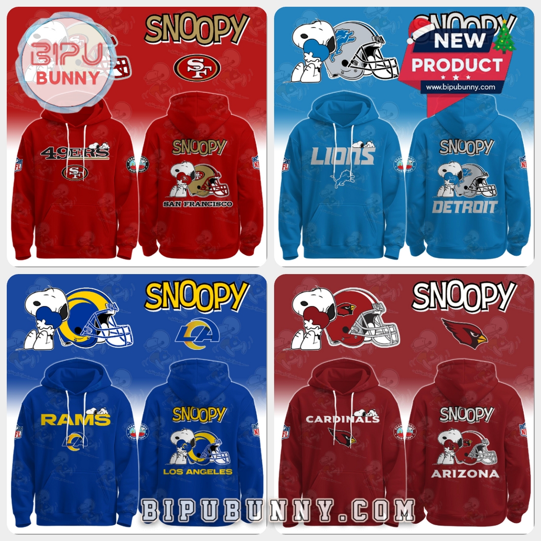 Peanuts character designs: Featuring Snoopy and Charlie Brown with NFL team helmets and logos, this hoodie combines two beloved franchises into one stylish piece.