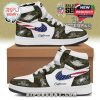 The All Team NFL x US Veterans Day Limited Edition Air Jordan 1 is a perfect blend of iconic sneaker culture and patriotic spirit. These limited edition sneakers are a nod to both NFL team pride and a tribute to U.S. military veterans. The shoes feature a distinct camouflage pattern that represents military service, combined with the iconic Air Jordan 1 silhouette, which is known for its comfortable fit and classic design. The base color of the sneakers is a military-inspired olive green with subtle earth-toned accents, and the Nike Swoosh stands out in white, providing a bold contrast.
