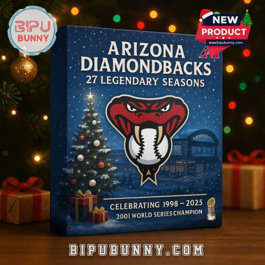 The calendar comes in a stunning dark blue box, designed to look like a magical winter night in Phoenix! The main visual is the iconic Diamondbacks Snakehead logo beautifully positioned over a baseball, standing out against a backdrop featuring a snowy Christmas tree adorned with twinkling lights and wrapped gifts! You can spot the team’s arena subtly in the background, anchoring the design in a familiar place! The box prominently displays the text “ARIZONA DIAMONDBACKS 27 LEGENDARY SEASONS” and “CELEBRATING 1998-2025 2001 WORLD SERIES CHAMPION” in crisp white and gold lettering! The overall feel is premium and deeply commemorative!
