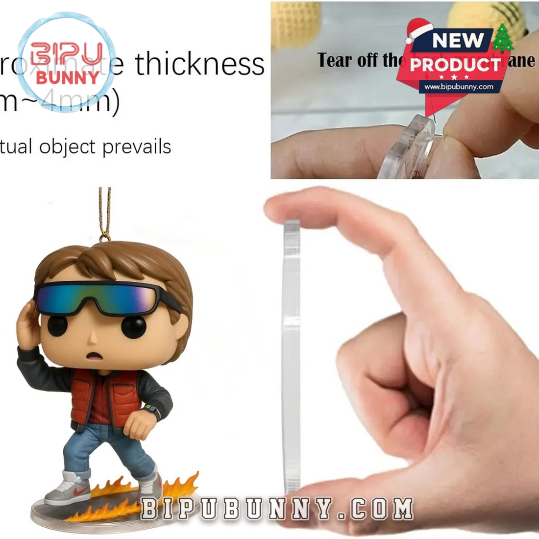 Each ornament is made of high-quality acrylic, with a thickness of 3mm to 4mm, giving them a sturdy feel while staying light enough to hang. The glossy surface is protected by a peel-off film to prevent scratches during transit. Characters like Marty (in multiple outfits), Doc Brown, Jennifer, Biff, and even Einstein the dog are included. Every figure is printed in full color with precise details—sunglasses, jackets, hairstyles, props like a hoverboard, or Doc’s yellow hazmat suit. Fans will also enjoy miniatures of the DeLorean, the clock tower, and other references like the “Hill Valley Telegraph” or Enchantment Under the Sea dance sign.