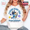 This Bluey “I Wear Blue For Autism Awareness Accept Understand Love” T-shirt stands as a heartfelt and visually engaging garment designed to promote a vital cause, seamlessly blending the universally beloved animated character with a powerful message of advocacy. The shirt prominently features Bluey, the energetic and imaginative Blue Heeler pup from the popular children’s television series, integrated into a design that champions autism awareness. The central graphic showcases Bluey, often depicted in a supportive or curious pose, perhaps with a subtle blue accent in her design, alongside the impactful text, “I Wear Blue For Autism Awareness Accept Understand Love.” This specific phrasing moves beyond mere recognition, urging a deeper connection by emphasizing the crucial elements of acceptance, understanding, and love, which are fundamental for fostering inclusive communities for individuals on the autism spectrum. The blue color, deeply symbolic of autism awareness, is cleverly incorporated, either as the dominant color of the shirt itself, or as a vibrant hue within the graphic and text, making the wearer’s commitment unmistakable.