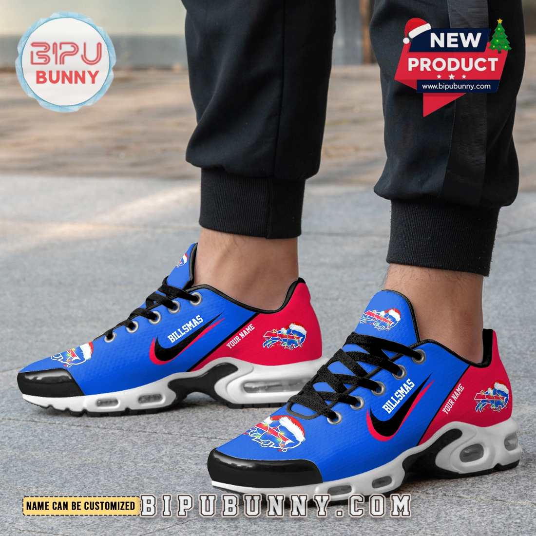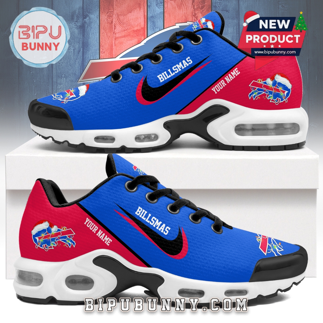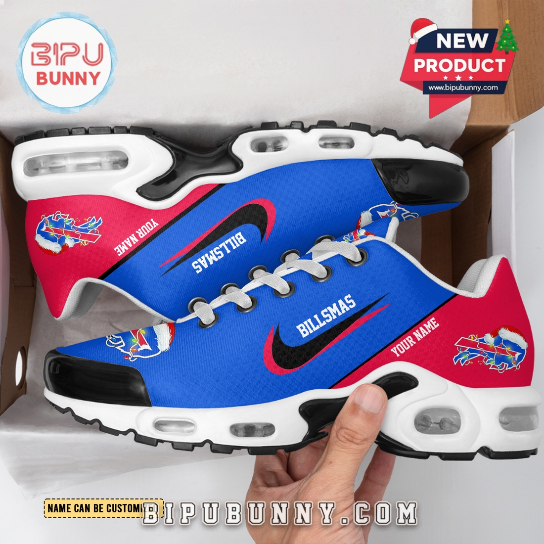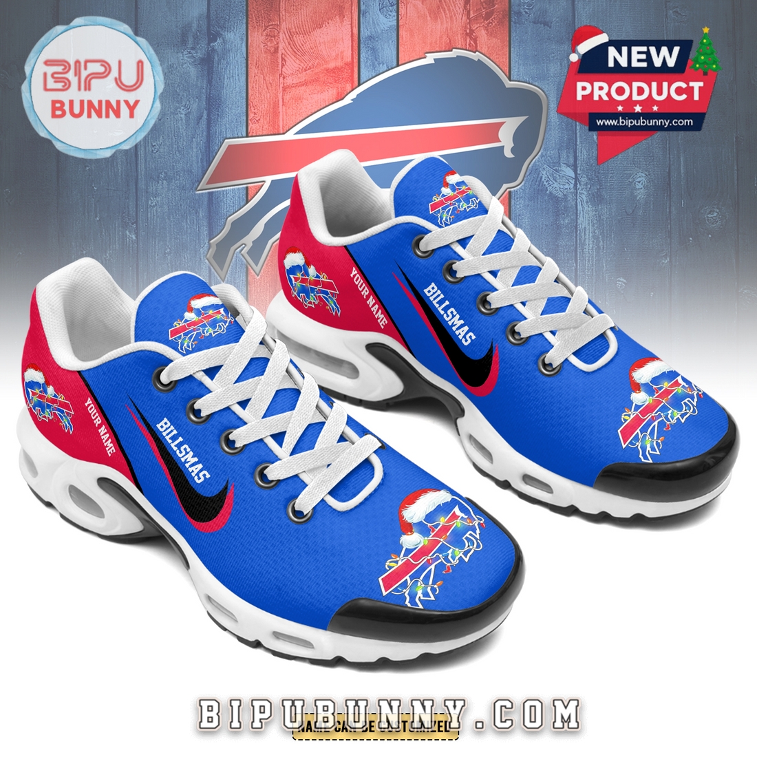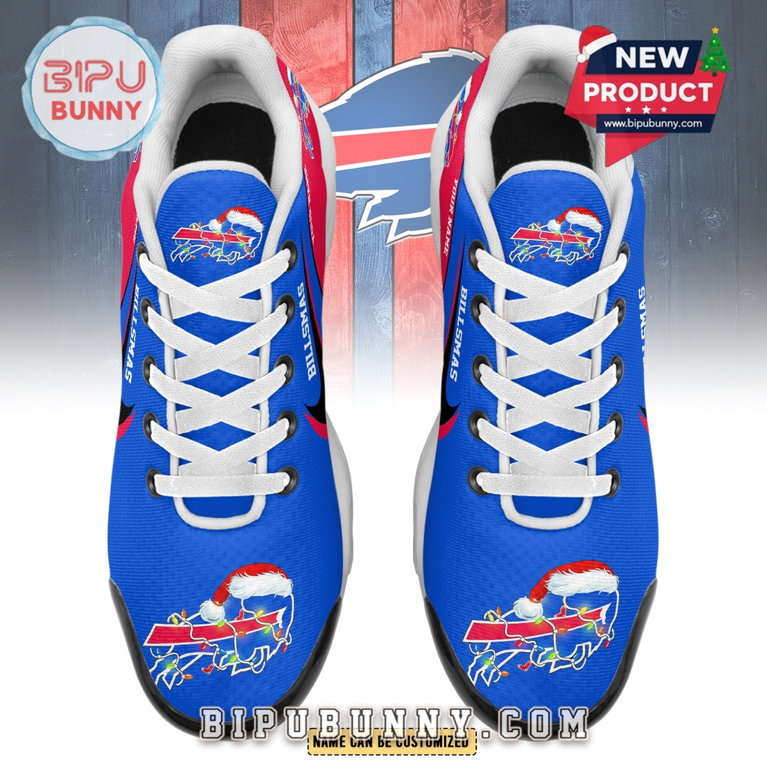 The Buffalo Bills TN Shoes Sneakers For Men And Women bring team pride and everyday comfort together in a design that feels both sporty and fun. These sneakers use a bright mix of royal blue, red, white, and black, inspired by the team’s signature colors. The upper features lightweight synthetic fabric that stays breathable throughout the day, while the printed graphics include the Buffalo Bills logo wearing a Santa hat, placed on the toe area, tongue, and heel for a playful seasonal touch. Along the sides, you’ll find clear team text such as “Billsmas,” plus a space for a customizable name on the red heel panel. White laces, black trim on the toe guard, and a solid white midsole keep the look clean and balanced.