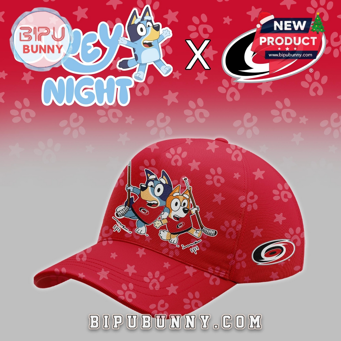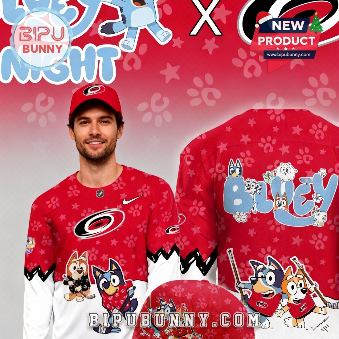 The Carolina Hurricanes NHL Bluey Night Limited Hockey Jersey is a special release created for fans who enjoy sports culture mixed with playful character design. This jersey features a bold red base inspired by the Carolina Hurricanes team colors, combined with clean white sections on the lower body and sleeves for balance. The fabric is lightweight polyester with breathable mesh construction, helping airflow during wear and keeping the body comfortable for long periods. The surface includes small paw print patterns subtly spread across the red background, adding texture without overwhelming the overall look.