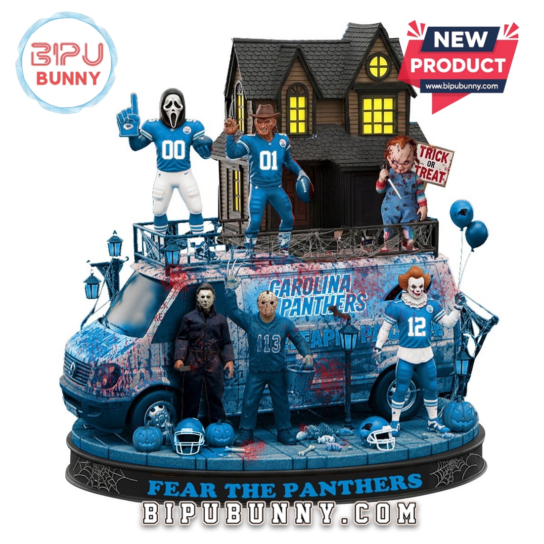 The Carolina Panthers Halloween Collectible Figures are a perfect blend of football fandom and Halloween fun. These figures feature horror movie icons such as Michael Myers, Freddy Krueger, and Chucky, all donning Carolina Panthers team uniforms in their signature colors of black, blue, and silver. Made from high-quality polyresin, these figures are meticulously designed with intricate details, including team logos, jersey numbers, and facial features that stay true to the characters. The figures are posed around a haunted van, which is decorated with spooky pumpkins, creepy lanterns, and a “Trick or Treat” sign, all contributing to the Halloween theme. The base of the display proudly states, “FEAR THE PANTHERS,” making it a must-have for any Carolina Panthers fan or collector. These figures bring a fun and eerie vibe to any space, whether you’re displaying them for Halloween or keeping them on display year-round.
