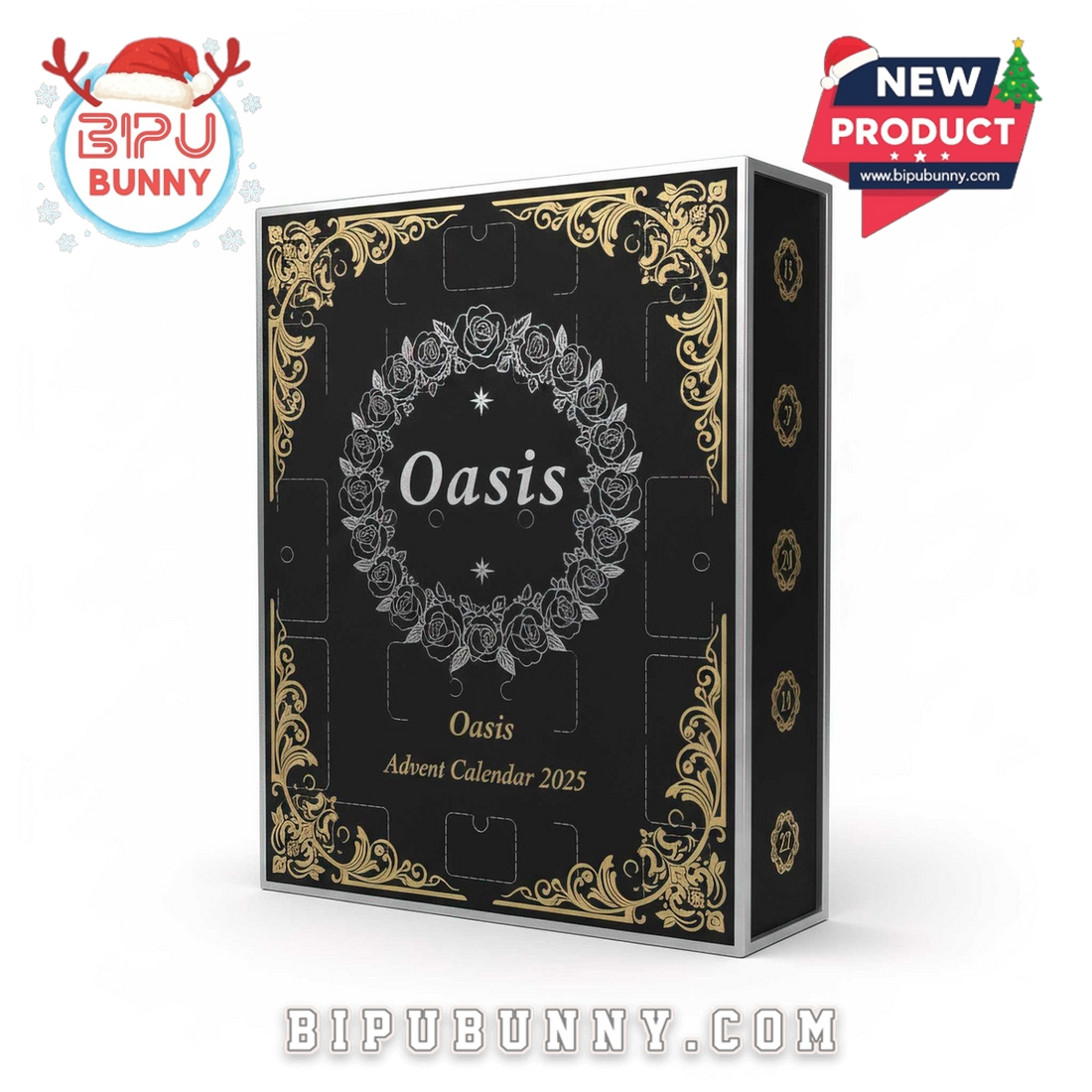 The Christmas Oasis Advent Calendar 2025 is a tribute to one of the most iconic rock bands of all time, designed to bring a unique musical twist to your holiday countdown. This limited-edition calendar features a sleek black box adorned with golden vintage floral borders and a delicate wreath of silver roses framing the Oasis logo. The box opens to reveal 24 numbered compartments, each hiding a collectible surprise that reflects the band’s legendary career.