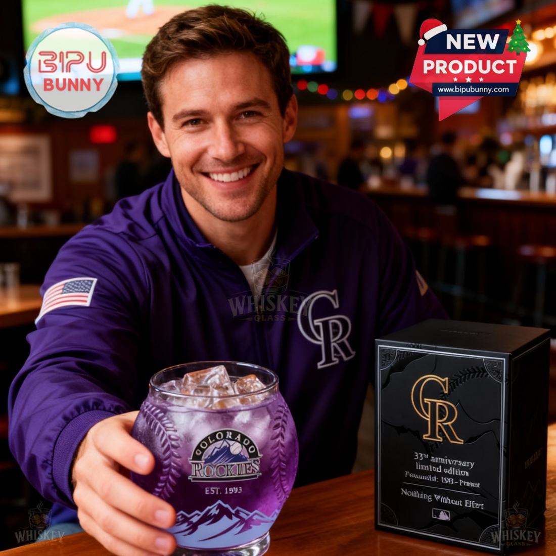 The Colorado Rockies 33rd Anniversary Whiskey Glass is a bold and meaningful piece designed for fans who appreciate both function and team history. The glass is made from thick high quality clear glass that feels solid and steady when held. Its most striking feature is the rich purple color that fills the lower portion of the glass, inspired by the Rockies signature team color. The upper section remains clear, allowing the drink and ice to stand out while balancing the overall look.