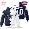 This distinctive Dallas Cowboys 2025 NFL Home Mix Away Hoodie represents an unparalleled blend of team spirit and contemporary design, meticulously engineered to cater to the discerning fan seeking both comfort and a unique expression of their loyalty. Its “Home Mix Away” concept is not merely a name but a brilliantly executed aesthetic choice, seamlessly integrating the iconic visual elements traditionally associated with both the Cowboys’ home and away kits. Imagine the classic deep navy of the home jersey forming the primary body, providing a rich, formidable foundation, while strategically placed accents or sleeve panels might echo the crisp, clean white of their away uniform, perhaps subtly outlined with the signature silver of the star. This thoughtful integration creates a dynamic, layered look that stands apart from conventional single-color fan apparel, offering a visual narrative of the team’s multifaceted identity. The 2025 designation implies a forward-looking design, presenting a fresh take that respects tradition while embracing modern trends in sportswear, ensuring wearers are ahead of the curve in their fan fashion.