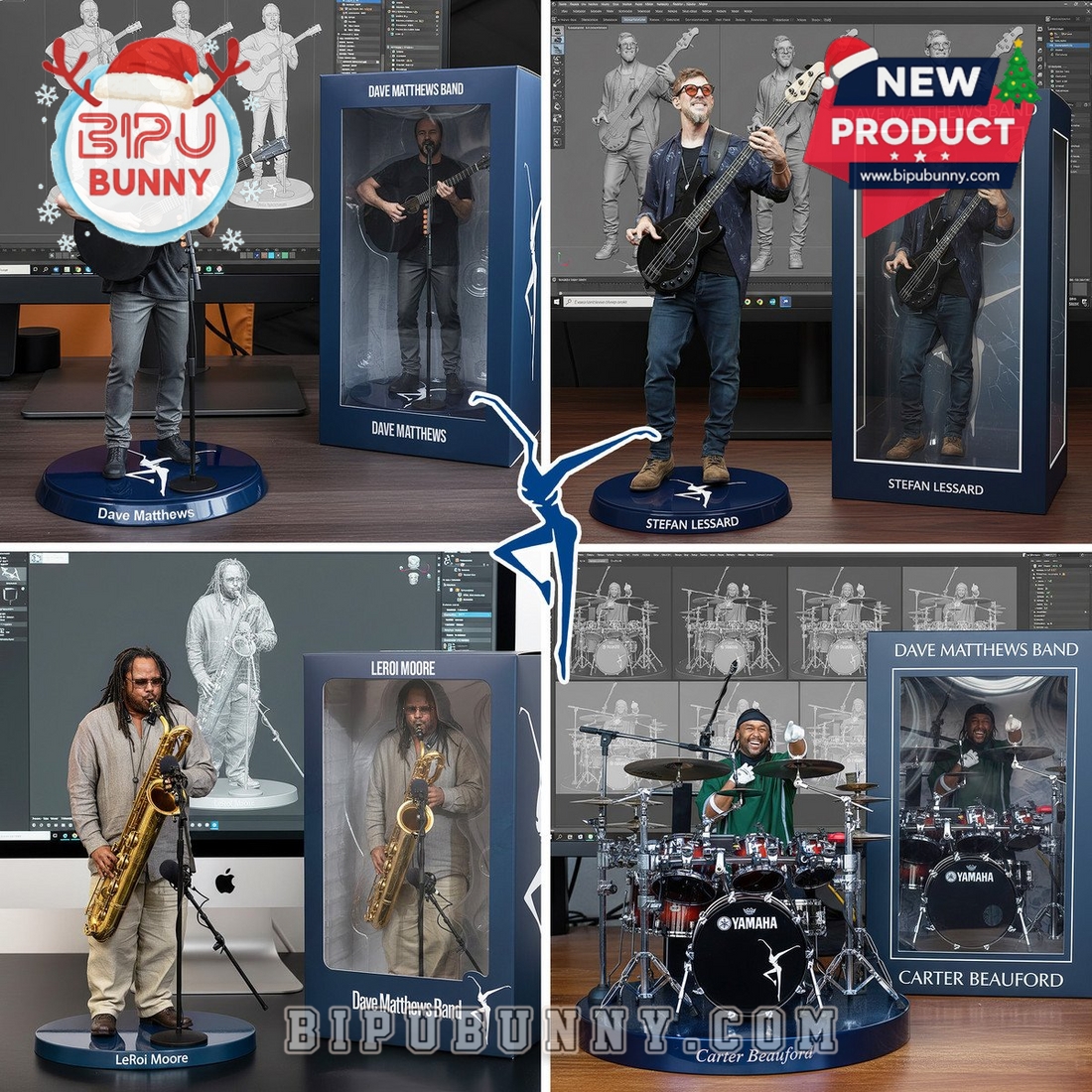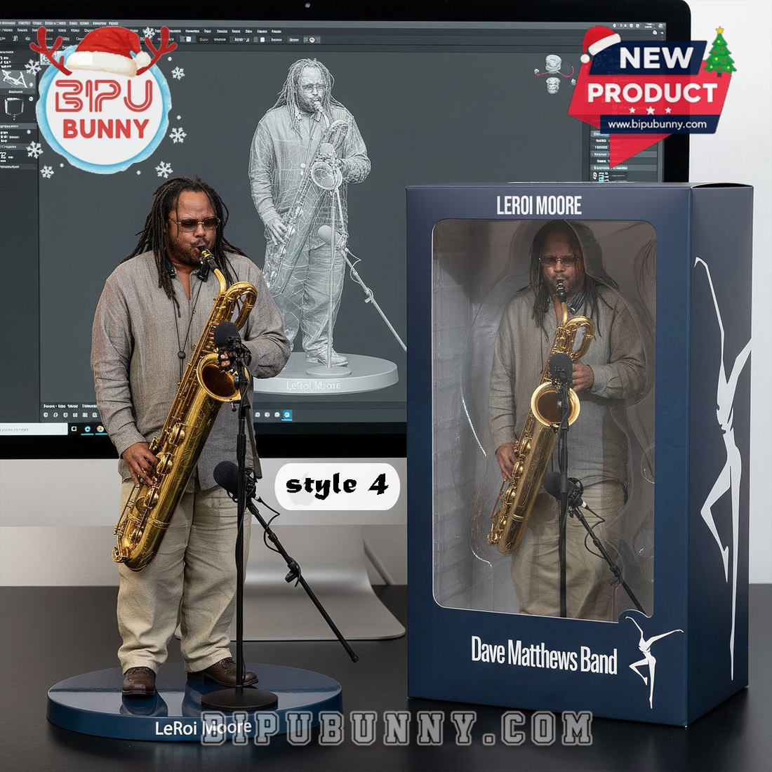 - Style 4 (LeRoi Moore): A heartfelt tribute, this style depicts LeRoi playing the baritone saxophone with calm focus. Two microphones are placed in front, and the base includes a faint texture resembling a stage rug. His earth-tone outfit adds a grounding, warm contrast.