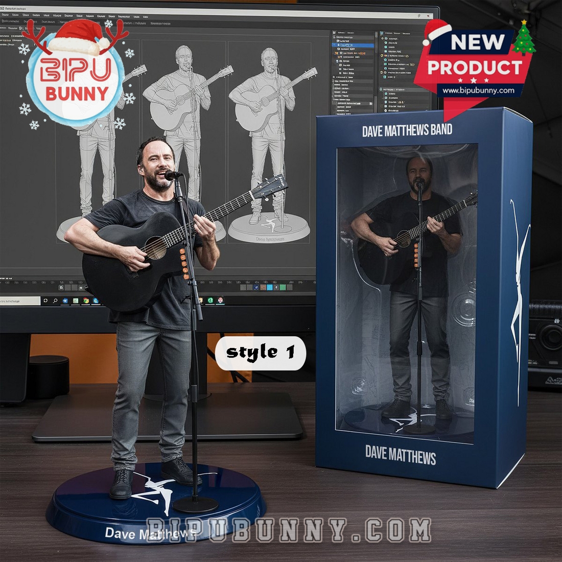 - Style 1 (Dave Matthews): Featuring Dave with a matte-black acoustic guitar and microphone in front of him. The pose is mid-performance, with a relaxed expression and slight body lean. His signature symbol appears on the round navy base, with subtle grain lines etched near the microphone stand.