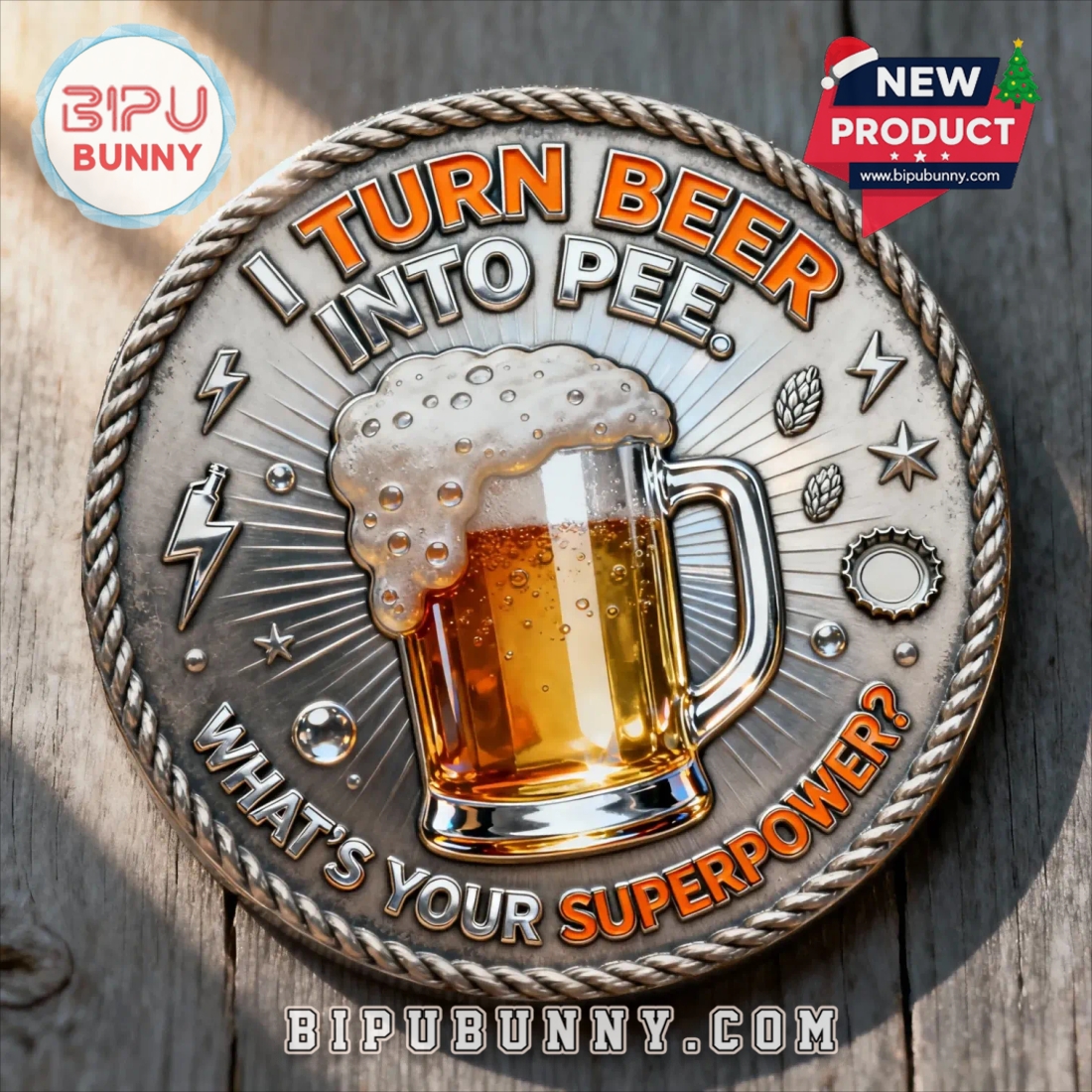 Flip the coin and the humor continues. The reverse side displays a single foamy beer mug with bubbles rising toward the edge. Around it, in bold fonts, the quote says: “I Turn Beer Into Pee. What’s Your Superpower?” The beer glass shines with a mix of orange, gold, and clear epoxy effects, adding depth and shine. Small icons like lightning bolts, hops, bottle caps, and stars decorate the rim, giving it a lighthearted, playful style. The edge of the coin features a rope-textured border, adding grip and character. The coin is about 2 inches wide, easy to carry or display, and durable enough to resist scratches.