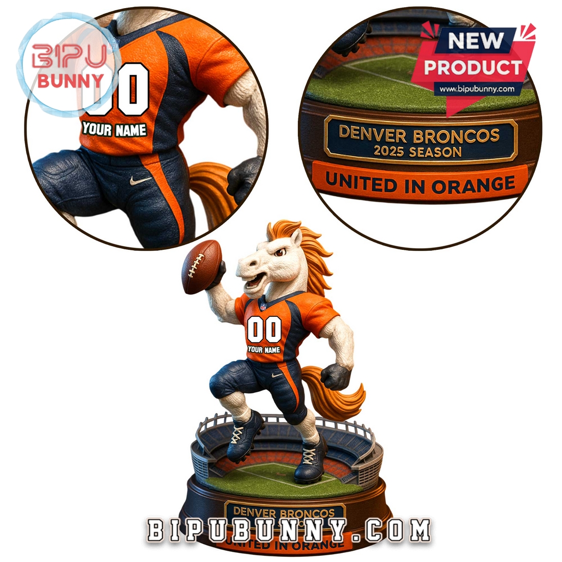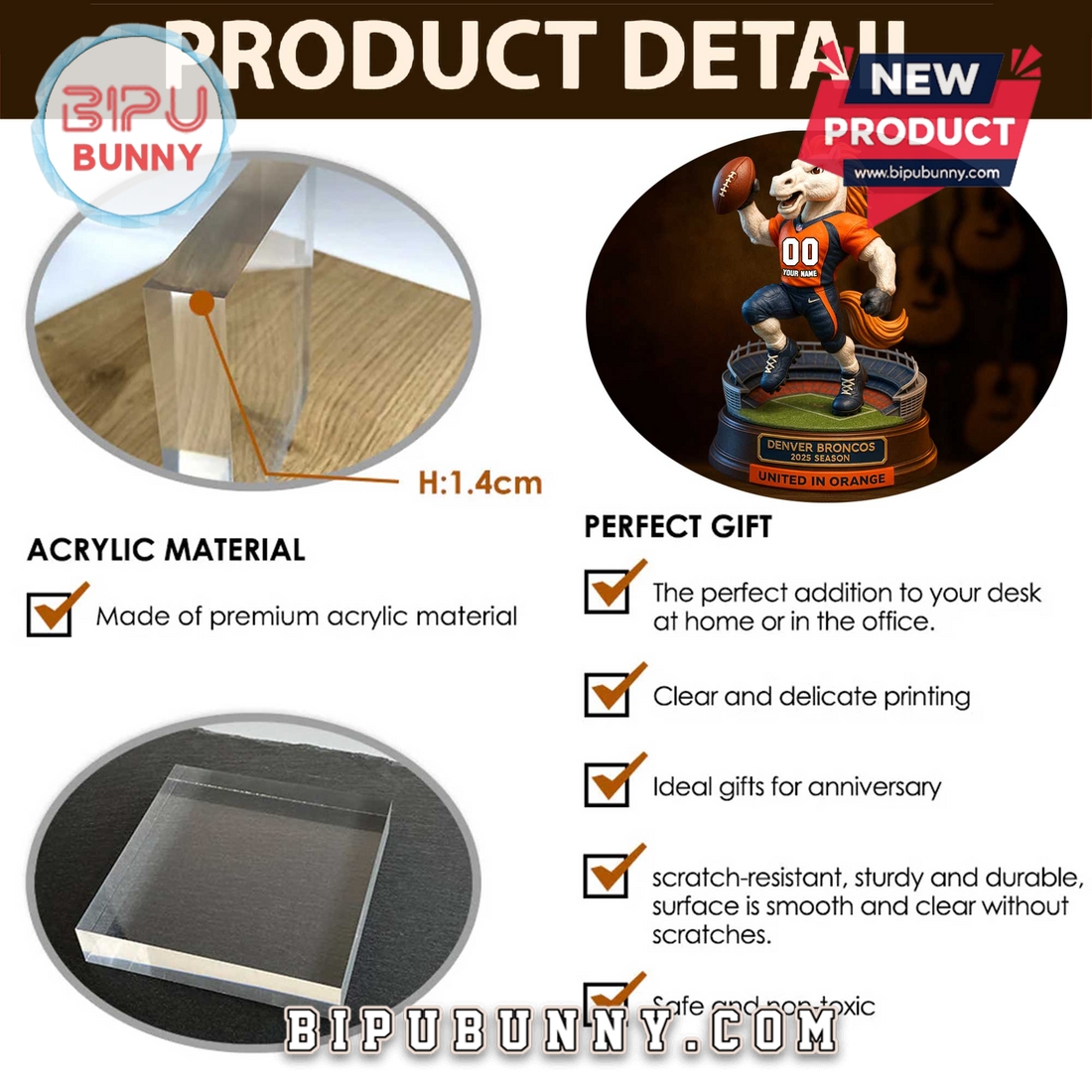 Denver Broncos Acrylic Standee Figures bring game day energy to your desk or shelf with a bold orange and navy palette that mirrors the team spirit, anchored by a deep brown football and a white horse mane for sharp contrast! Each figure is made from clear high clarity acrylic with clean laser cut edges, UV printed art on layered panels for depth, and a snug slotted base that keeps the piece upright on flat surfaces! The sculpted look depicts a charging horse quarterback holding the ball in the right hand, jersey panels outlined in navy piping, and fine textures that mimic stitching and leather grain across the uniform and shoes! The front plaque reads Denver Broncos 2025 Season, and a lower ring can include the fan motto United in Orange for an extra touch of pride! A small but useful perk is the customizable jersey zone on the chest so you can add a name and number, turning a standout figure into a personal keepsake or desk nameplate! Styles include a classic action pose with stadium style base, a bright studio variant for modern rooms, and a warm home decor variant for cozy shelves, all sharing the same premium acrylic finish and compact footprint for easy placement in offices, game rooms, or gift baskets!