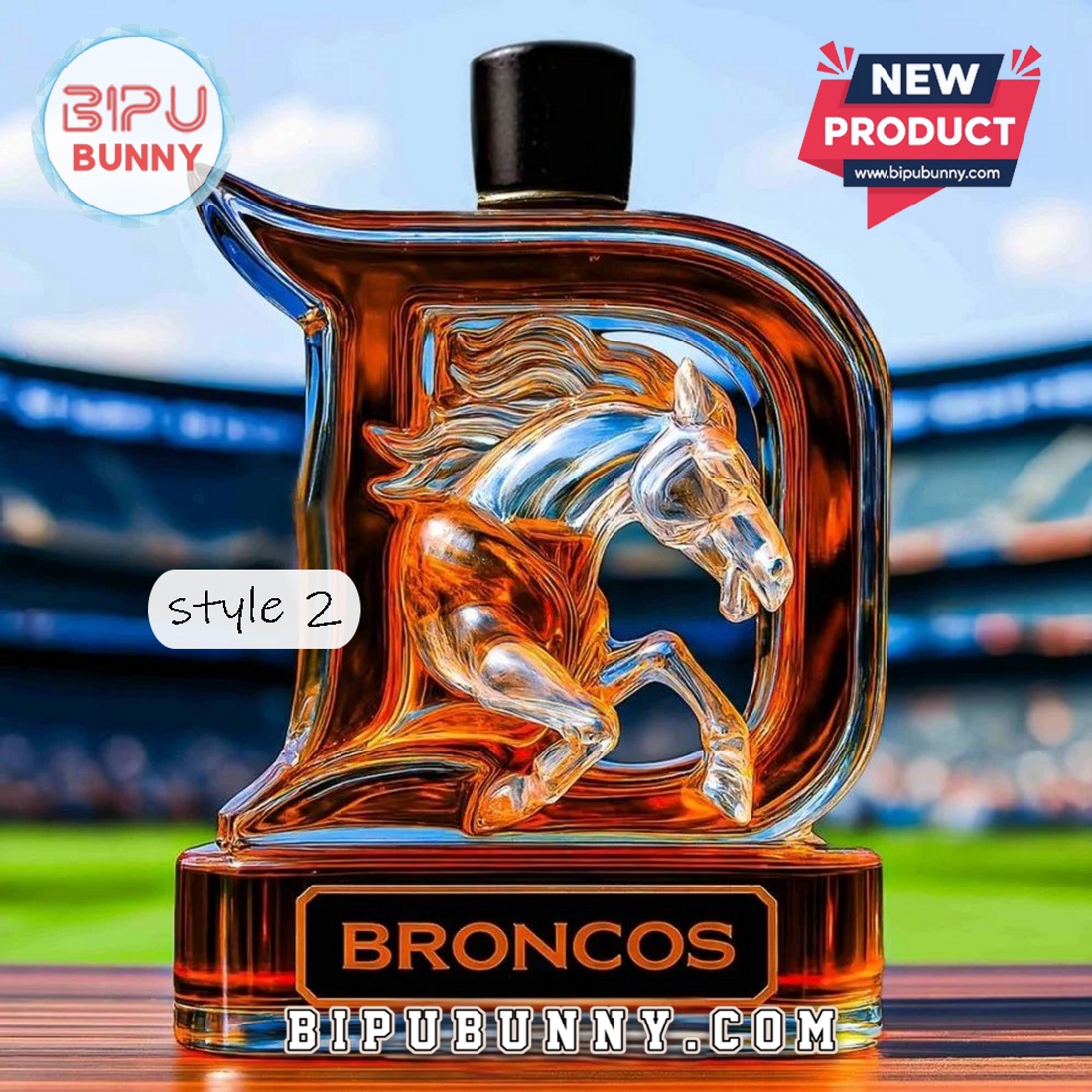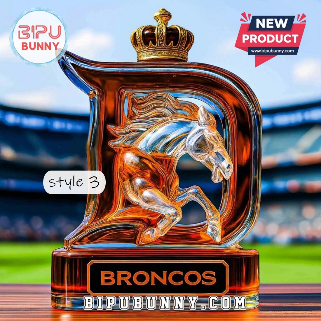 The bottle itself is made from premium glass, ensuring durability while maintaining its delicate, artistic features. The broncos logo is prominently displayed at the base, adding a layer of authenticity to the design. There are multiple styles available, including Style 1, which features a sleek black top; Style 2, which has a refined black finish; and Style 3, which includes a crown atop the bottle, bringing an extra touch of class and prestige. Each style showcases the same incredible horse motif, but with slight variations in the finishing details. Whether you choose a minimalistic look or a more regal touch with the crown, this bottle is perfect for display or as a unique collectible.