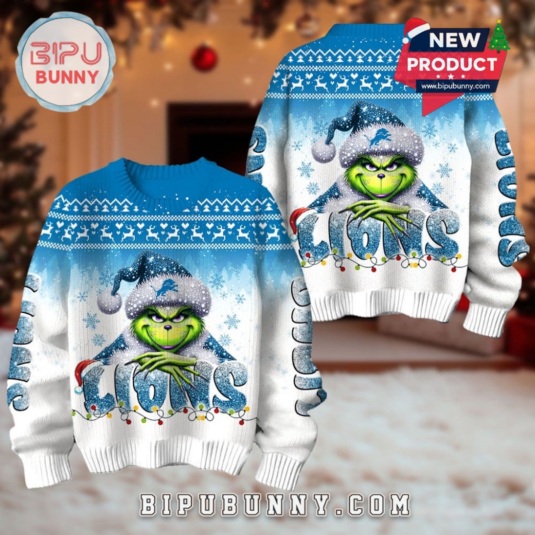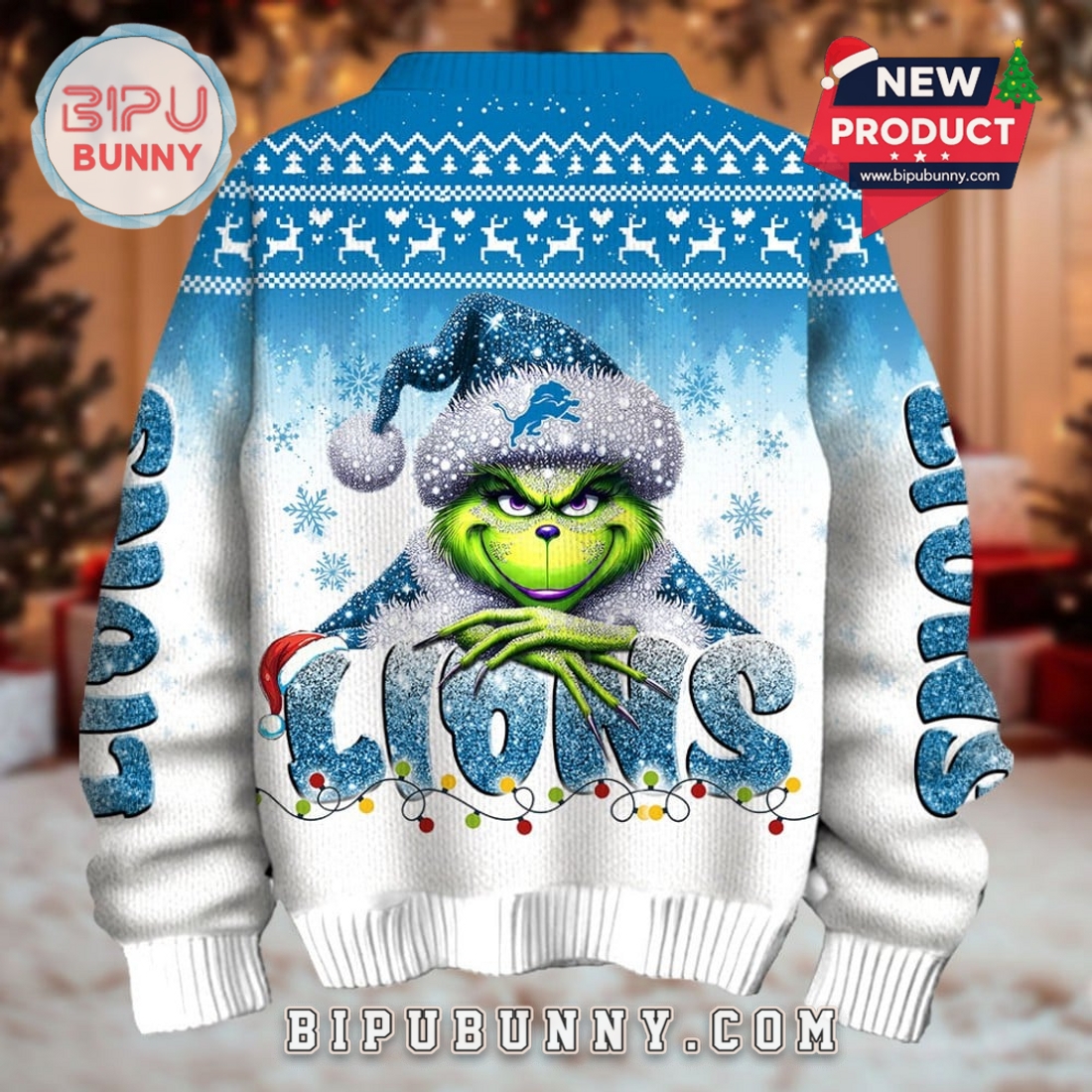The front and back both feature a grinning Grinch dressed in a sparkling Lions Santa hat, centered above large, icy-textured “LIONS” lettering wrapped in colorful Christmas lights. Snowflakes scatter across the background, with knitted reindeer and tree motifs stitched into the shoulders for extra holiday flair. The sleeves spell “LIONS” in big frosty letters too, creating a 360° festive look from every angle. Made from a soft, breathable acrylic blend, the sweater offers comfort that lasts all day — no itching, no overheating, just cozy game-day (or Christmas party) warmth.