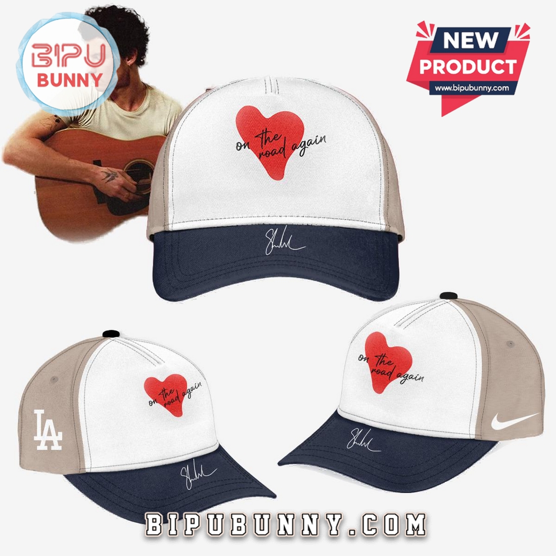 The Dodgers x Shawn Mendes On The Road Again Cap blends music and sports in a fresh, collectible design. This three-tone cap features a crisp white front panel, deep navy brim, and soft beige side panels — a color combo that feels both modern and timeless. Front and center sits a bold red heart graphic with handwritten-style text reading “on the road again”, a direct nod to Shawn Mendes’ 2025 Europe tour theme. Just below the brim, you’ll find Shawn’s signature printed in white, adding an authentic artist touch.