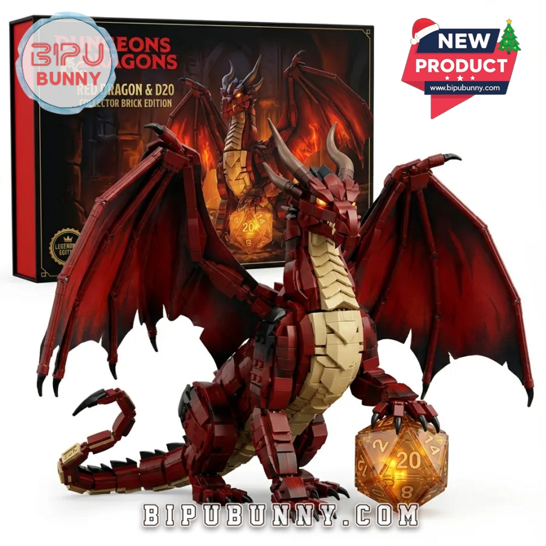 The Dungeons and Dragons Collector Brick Edition is a detailed fantasy building set designed for tabletop role playing fans and display collectors. The centerpiece of the set is a deep red dragon model built from high quality interlocking bricks with a smooth matte finish. Accents in dark red and warm gold tones highlight the chest armor scales horns claws and tail. The dragon features wide spread wings with layered segments that add depth and movement to the design. At the front paw the model holds a translucent amber twenty sided dice, styled to look like it is glowing which adds a strong role playing theme and visual focus.