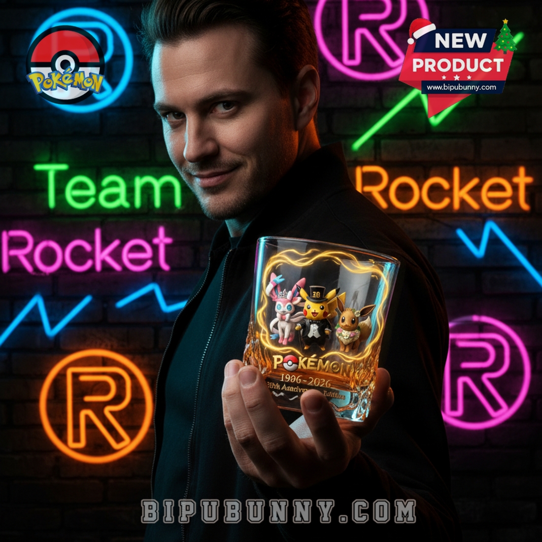 The Eevee Sylveon Pikachu 30th Anniversary Whiskey Glass is a playful and premium keepsake designed to honor three decades of Pokémon magic. Made with clear high-density glass, this tumbler captures the heart of fans with a vibrant, full-color design that wraps around the front. At the center stands Pikachu in a black tuxedo and top hat with the number “30” proudly marked in gold. On Pikachu’s left, Sylveon wears a pink tiara and a bright smile, while to the right, Eevee dons a flower necklace in a calm, celebratory pose.