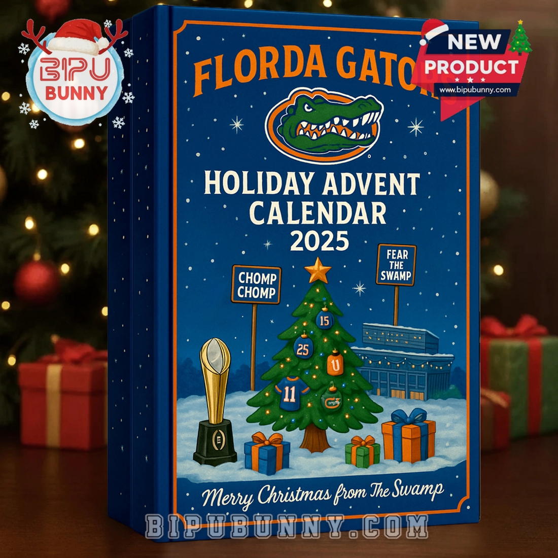 If you’re a Florida Gators fan or shopping for one, the Florida Gators Advent Calendar 2025 is the ultimate way to count down to Christmas with pride, fun, and tradition! This officially themed advent calendar is shaped like a sturdy book box in rich Gators blue and orange, with gold trim accents and a snowy holiday background. The cover features a cheerful Christmas tree decorated with numbered Gators-themed ornaments, flanked by signs that say “Chomp Chomp” and “Fear The Swamp” — iconic phrases every fan will recognize.