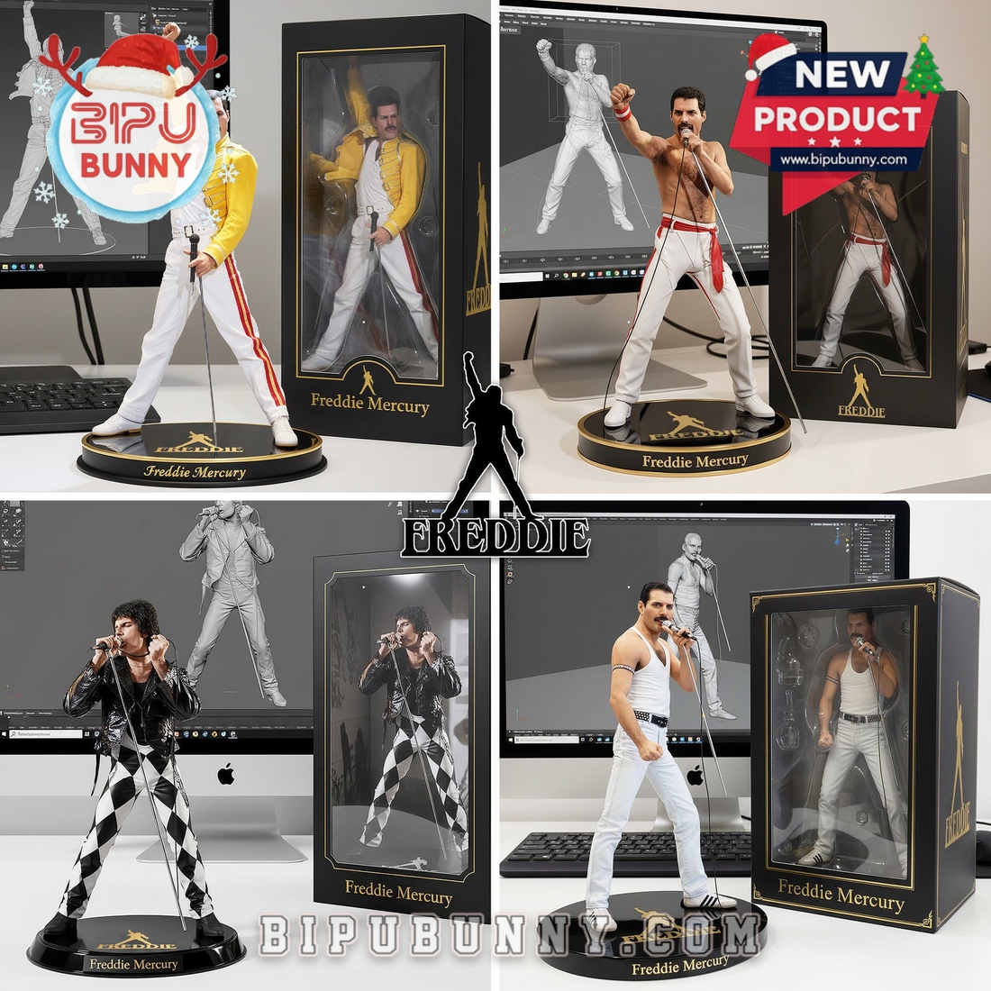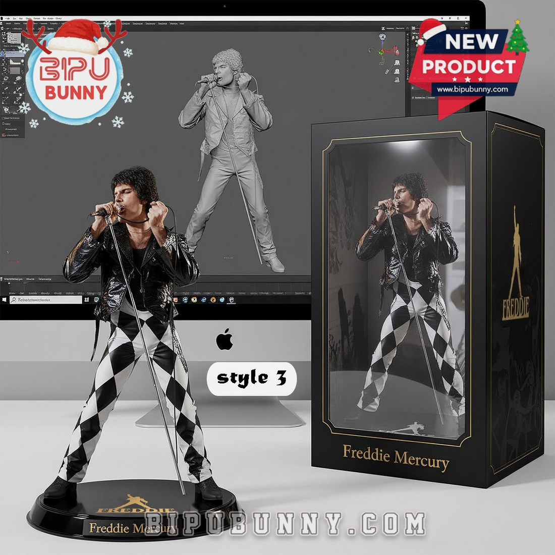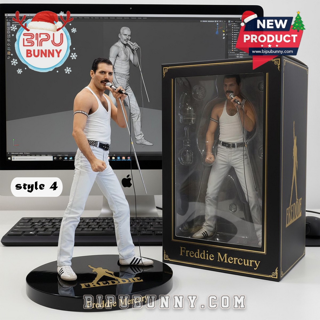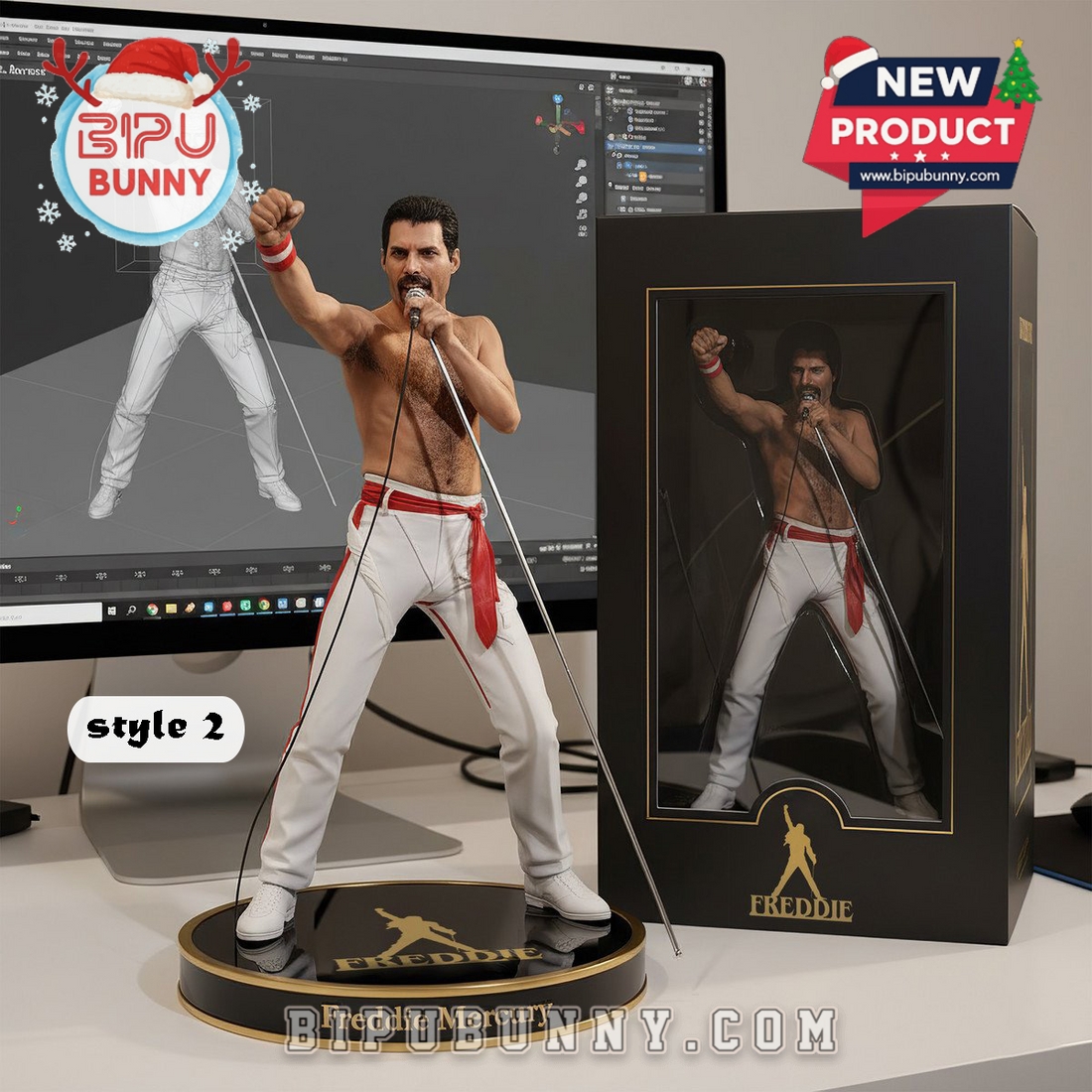 - Detailed design of Freddie Mercury in an iconic performance pose, highlighting his unmistakable stage presence.