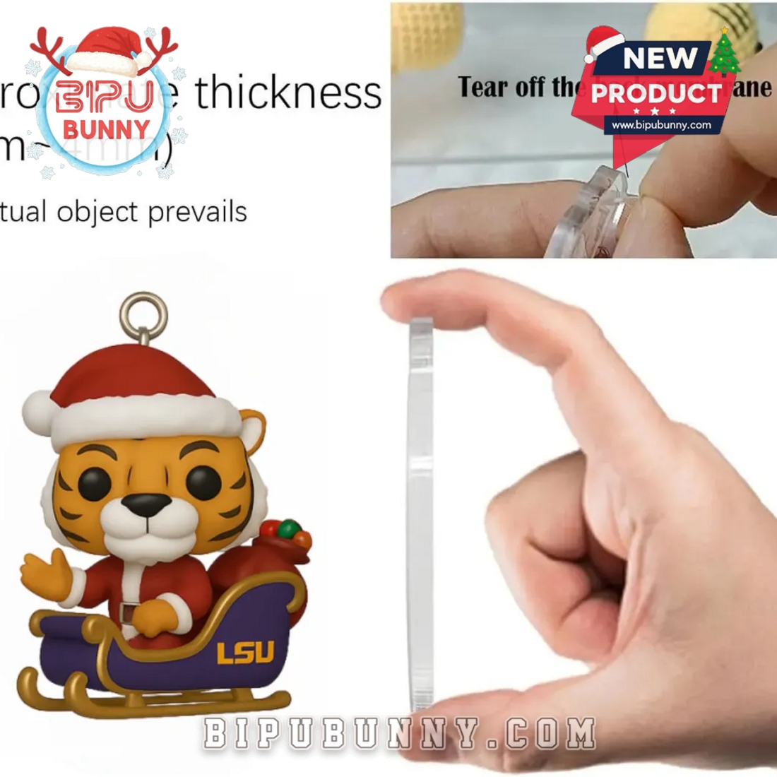 The overall design is rich in LSU purple and gold, enhanced with festive patterns like snowflakes, paw prints, and sports emblems (baseball, football) on both the box and characters. Every ornament comes with a top loop for easy hanging — perfect for Christmas trees, dorm décor, or even your car mirror. One tiny but fun detail: each piece includes a protective film you peel off before use, keeping your ornaments flawless right out of the box.