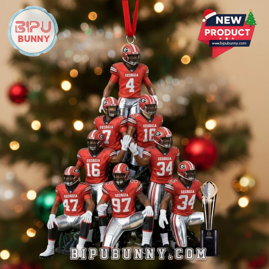 The Georgia Bulldogs Christmas Ornament 2025 is the perfect blend of college football pride and festive cheer. This unique ornament captures the strength and legacy of Georgia football in a standout pyramid formation, featuring nine Bulldogs players suited up in their iconic red and black uniforms. Each figure is posed in a stacked, team-like structure — with #4 standing tall at the top — and they’re all sharply detailed with visible jersey numbers, helmet logos, and the word “GEORGIA” boldly across each chest.