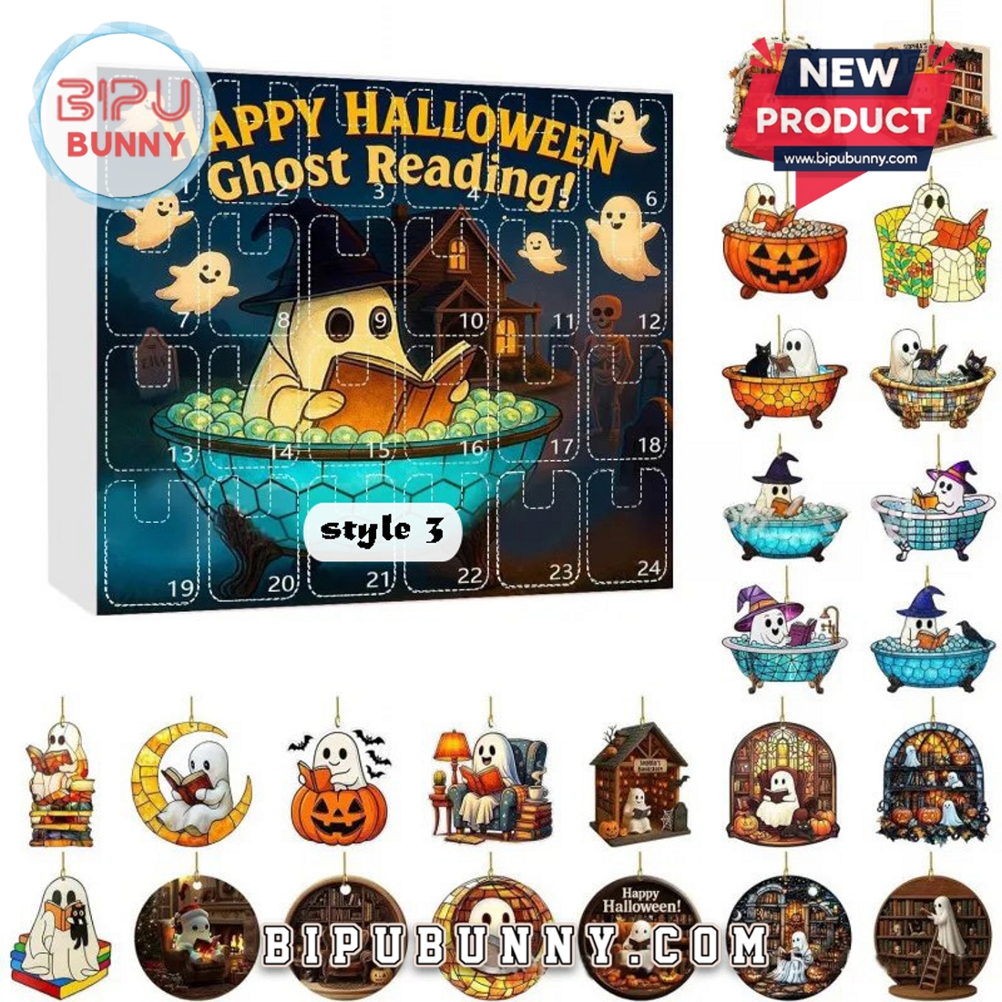 The Halloween Advent Calendar with Ghost Ornaments is a playful and creative way to count down the spooky season. Each box comes in vibrant designs with warm backgrounds featuring ghosts in cozy or fun scenarios, from sitting among glowing pumpkins to reading books in bubbling cauldrons. The calendars are structured with 24 windows, each hiding a small ornament that continues the ghostly theme. Ornaments include mini pumpkins, stained-glass style ghosts, tiny libraries, cauldrons, and playful bathtubs, all designed with colorful detail. The colors range from deep purples and oranges to candlelit yellows and glowing greens, creating a balance of mystery and warmth. Each style has its own personality: Style 1 features a ghost beside pumpkins, Style 2 has a ghost seated in an armchair, Style 3 highlights a ghost inside a magical cauldron, and Style 4 adds a whimsical touch with a ghost in a witch hat and black cat. These unique touches make the product more than just a countdown—it becomes a decorative centerpiece for the season.