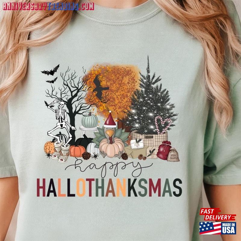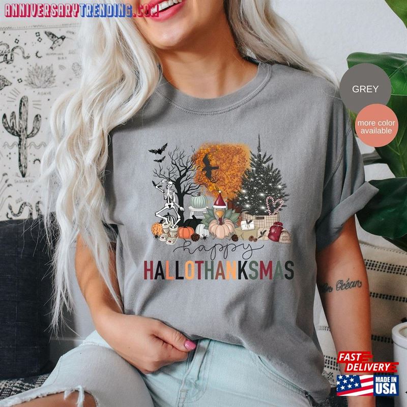 Featuring a classic fit with a modern twist, our Thanksgiving T-Shirt offers a flattering silhouette for all body types. Happy Hallothanksmas Shirt Halloween Comfort Colors Thanksgiving T-Shirt Classic is adorned with festive graphics that capture the essence of Thanksgiving, making it a fun and fashionable choice for any occasion. Pair it with jeans for a casual look, or dress it up with a blazer for a more polished appearance.