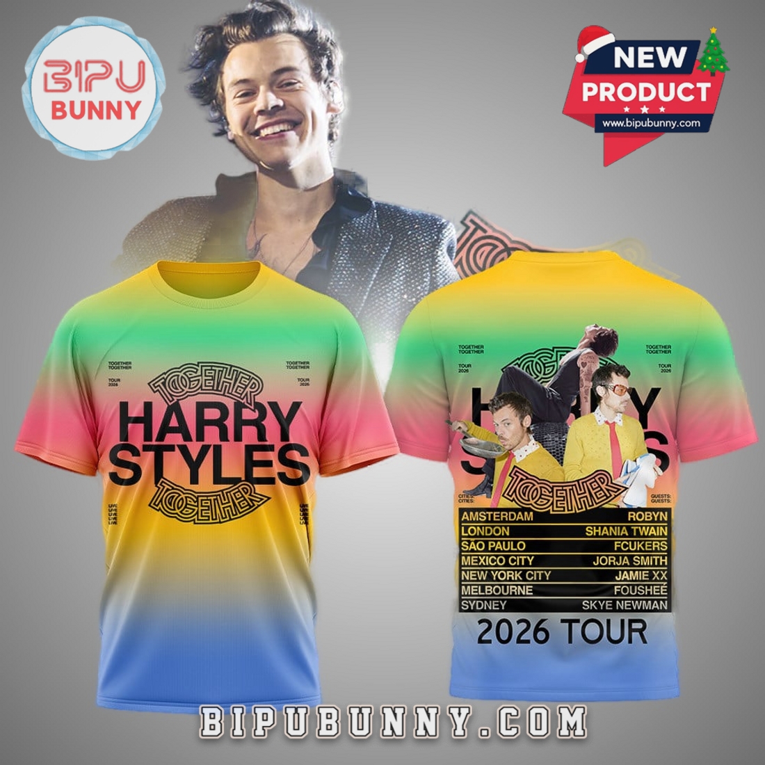 The advantages of owning this specific Harry Styles Together 2026 Tour Rainbow Shirt extend beyond its physical attributes. For fans, it’s a tangible piece of memorabilia, a wearable ticket stub to a shared experience, even if they couldn’t attend every show. It fosters a sense of belonging and community, serving as a visual cue to identify and connect with fellow “Harries” in any setting. Wearing the rainbow shirt is a declaration of admiration and a public endorsement of Harry’s positive messages of love and acceptance, allowing fans to project those values through their personal style. It meets the fundamental need for fans to physically embody their passion and allegiance to an artist who deeply resonates with them. Whether planning to attend a “Together 2026 Tour” date, re-watching past concert footage, or simply going about daily life, this shirt serves as a versatile wardrobe staple. It can be effortlessly paired with jeans for a casual look, layered under a jacket for cooler weather, or worn as the standout piece at a fan meet-up. Its bright, optimistic design makes it suitable for various occasions, injecting a dose of Harry Styles’ signature playful charm into any outfit. Ultimately, this Harry Styles Together 2026 Tour Rainbow Shirt offers an unparalleled blend of vibrant design, superior comfort, lasting quality, and profound emotional connection, making it an indispensable item for any dedicated fan seeking to showcase their devotion and cherish the memories of the “Together 2026 Tour.”