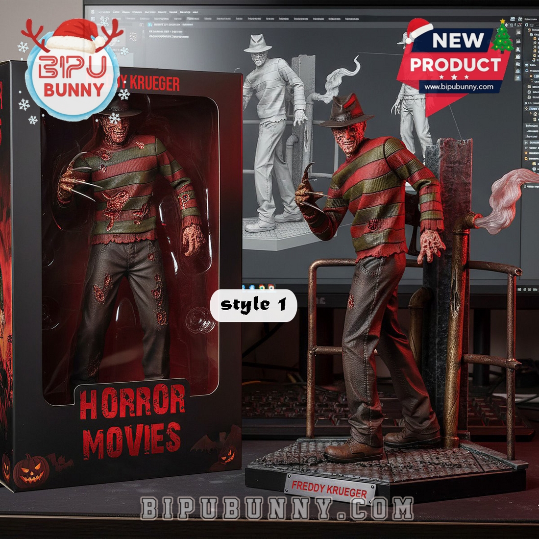 - Style 1: Freddy Krueger, posed in a threatening stance near a boiler pipe, with his claw glove raised mid-swing. His striped sweater is weathered, with burns and open wounds modeled into the figure.