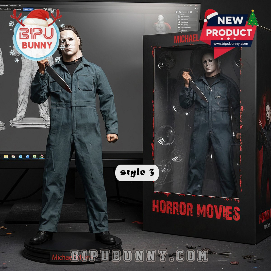 - Style 3: Michael Myers, gripping a kitchen knife in his iconic blank stare. He wears his classic blue jumpsuit, complete with dirt smudges and fabric fold detailing.