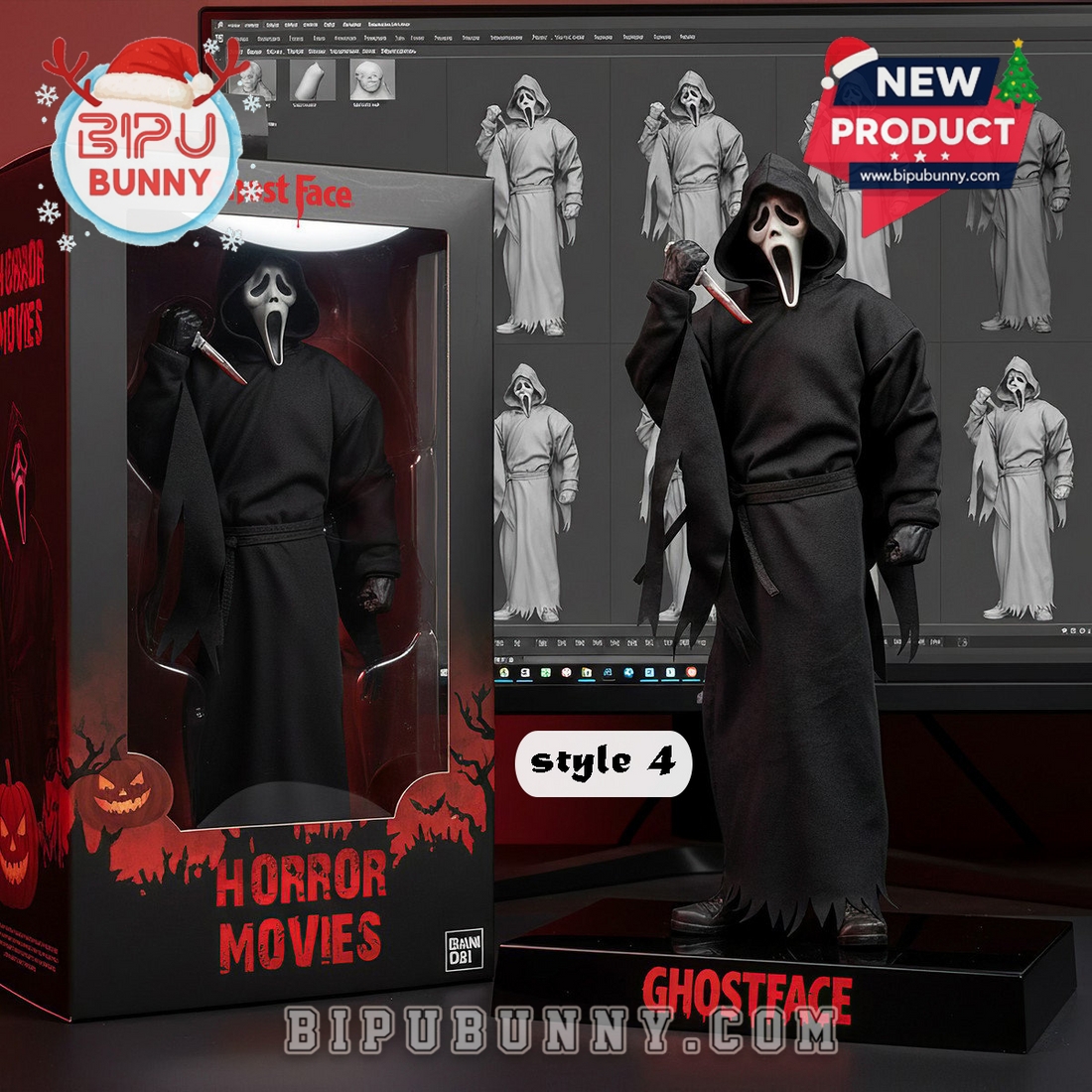 - Style 4: Ghostface, dressed in a shredded black robe with a flowing hood, ready to strike with a curved knife. His base is simple and sleek, with minimalist horror accents.