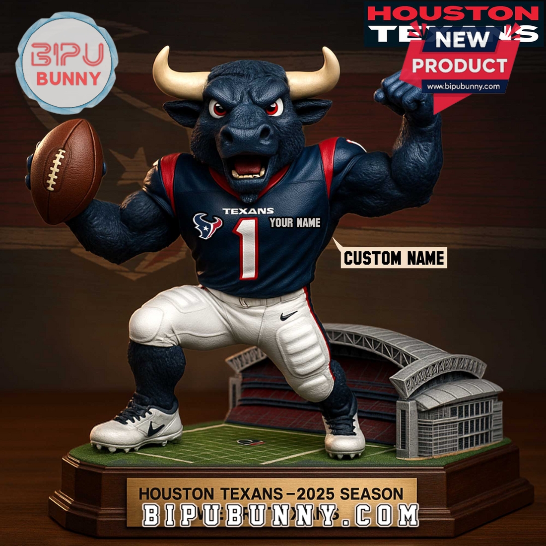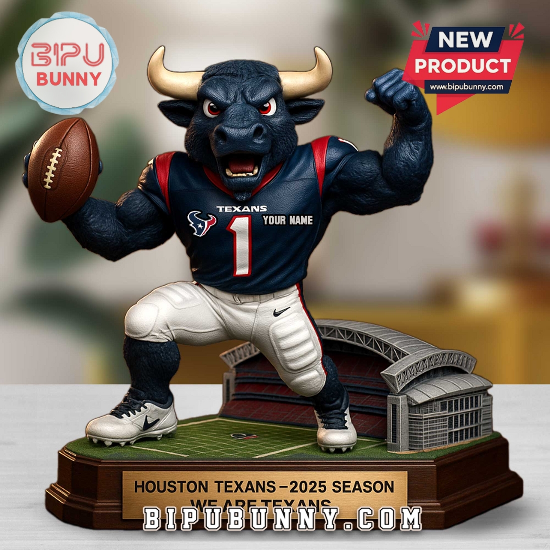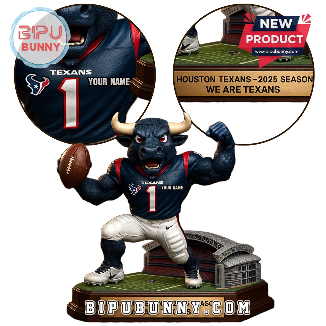 The figure is mounted on a miniature stadium base, complete with turf texture and structural details mimicking NRG Stadium. The engraved base reads “Houston Texans – 2025 Season” and “We Are Texans,” bringing a strong emotional connection to every fan. One of the standout features is the custom name printing on the mascot’s jersey, placed beneath the Texans logo and next to the bold number 1 — making each figure feel like your own part of the team.