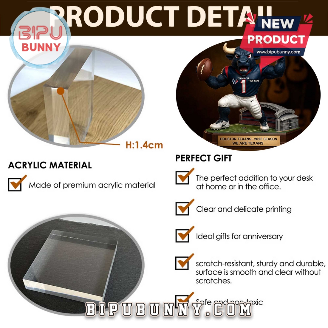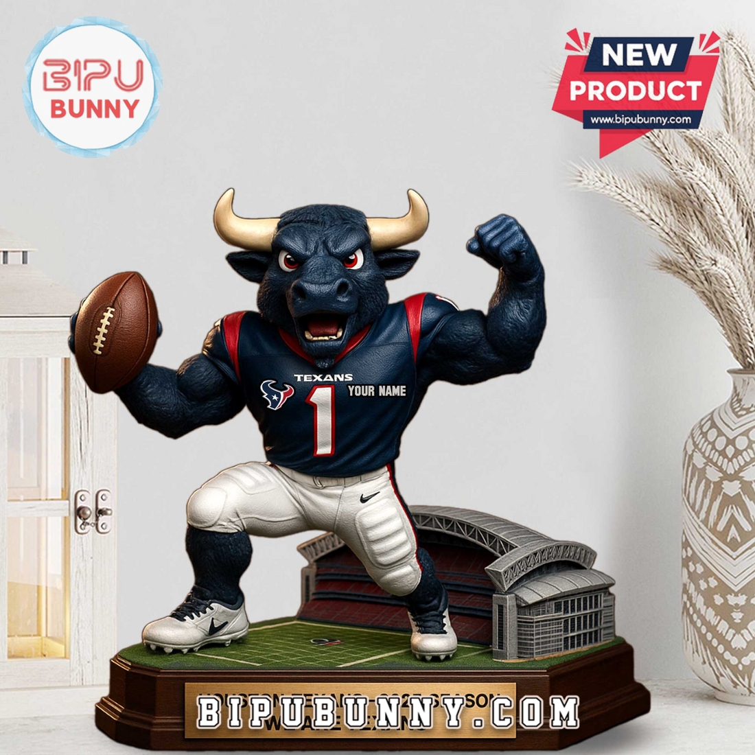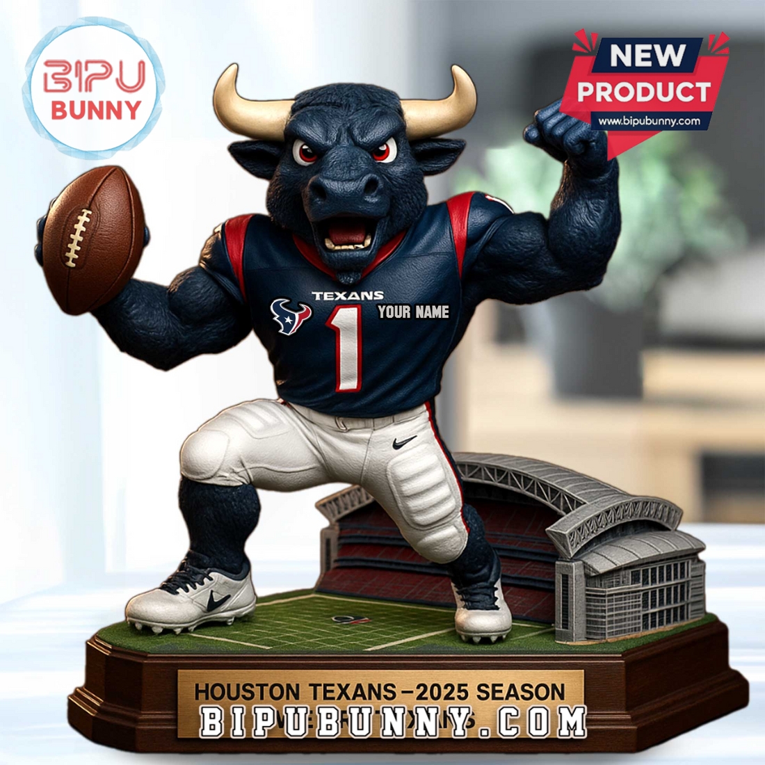 The figure is mounted on a miniature stadium base, complete with turf texture and structural details mimicking NRG Stadium. The engraved base reads “Houston Texans – 2025 Season” and “We Are Texans,” bringing a strong emotional connection to every fan. One of the standout features is the custom name printing on the mascot’s jersey, placed beneath the Texans logo and next to the bold number 1 — making each figure feel like your own part of the team.