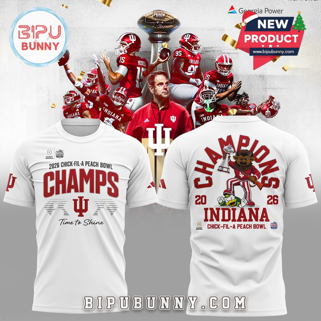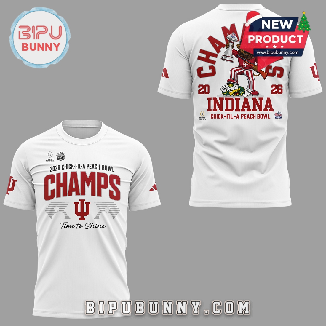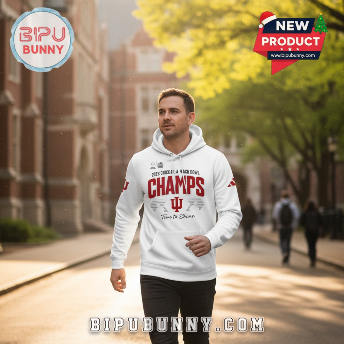 The Indiana Hoosiers 2025 Peach Bowl White Hoodie is more than just a pullover — it’s a trophy in wearable form. Designed to honor Indiana’s championship win, this hoodie pairs classic Hoosiers pride with modern styling and crisp detail. The bright white color gives it a fresh, standout look, while the bold red “CHAMPS” lettering across the chest delivers the message loud and clear. Just above it, the “2025 Chick-fil-A Peach Bowl” text adds official context, while below it, the IU logo and “Time to Shine” script finish the layout with confident flair.