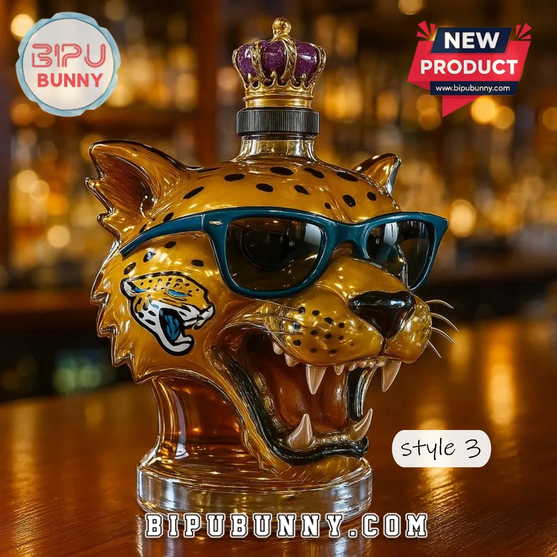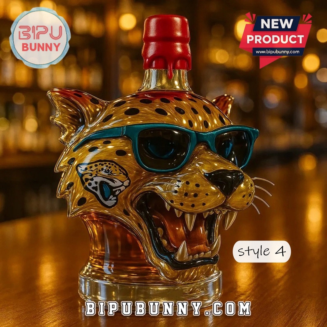 The Jacksonville Jaguars Whiskey Bottle is a bold and fun piece designed for both football fans and whiskey enthusiasts. The bottle features an eye-catching design shaped like a jaguar’s head, with a vibrant yellow color that mimics the Jacksonville Jaguars’ team colors. Made from high-quality glass, this bottle is not only a functional whiskey holder but also a unique piece of art. The jaguar’s fierce expression, detailed teeth, and iconic blue sunglasses add a playful and fierce touch to the design. The amber liquid inside perfectly complements the design, enhancing its visual appeal.