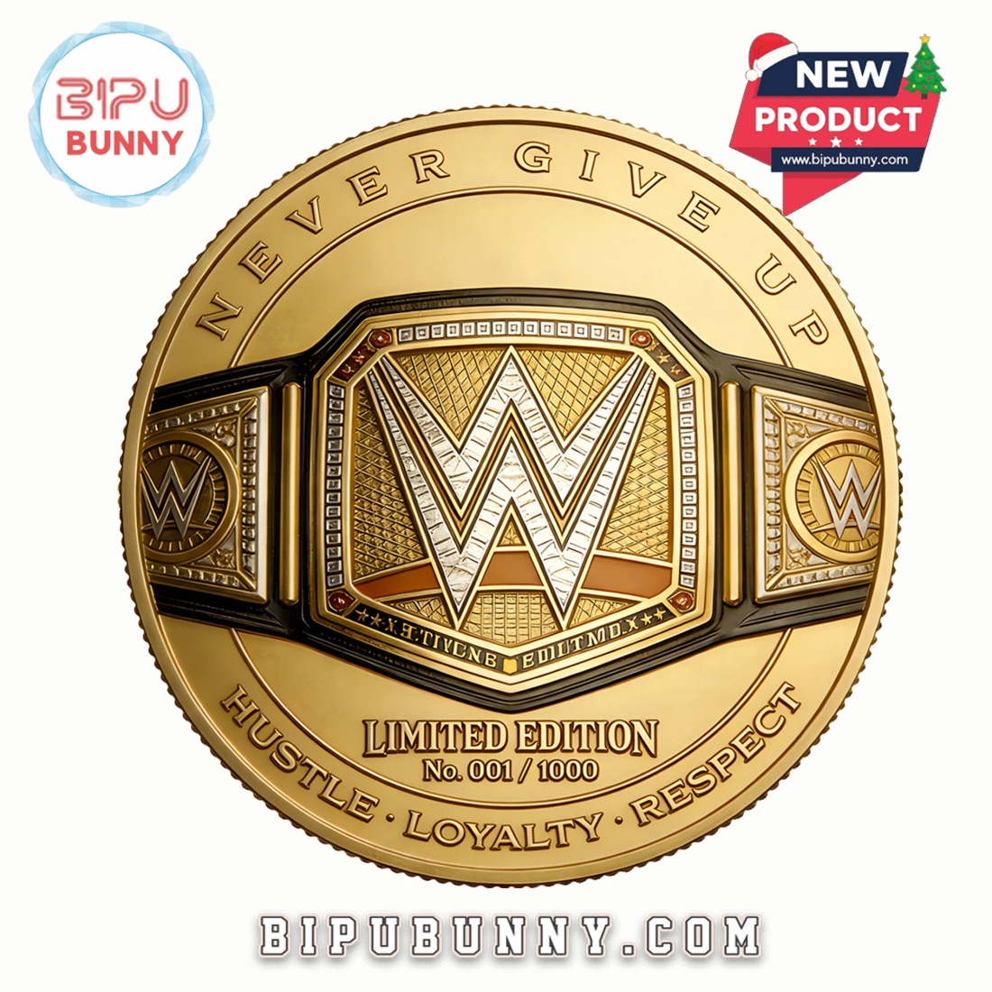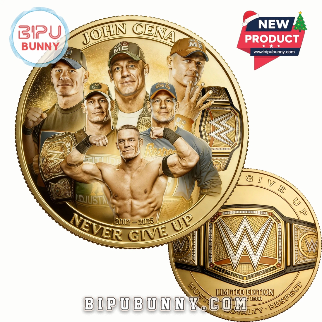 The John Cena Never Give Up Commemorative Coin is more than just a collector’s item—it’s a visual story of one of WWE’s greatest legends. This limited-edition coin is designed in a stunning gold-tone finish, capturing both the legacy and spirit of John Cena’s career from 2002 to 2025. On the front, you’ll find six highly detailed portraits of Cena in different signature looks, from his early days with the “Ruthless Aggression” era to the modern-day “Respect” shirt and “You Can’t See Me” cap. Every image is positioned in a circular montage, with his iconic shirt slogans like “Never Give Up” and “Hustle, Loyalty, Respect” subtly engraved in the background.