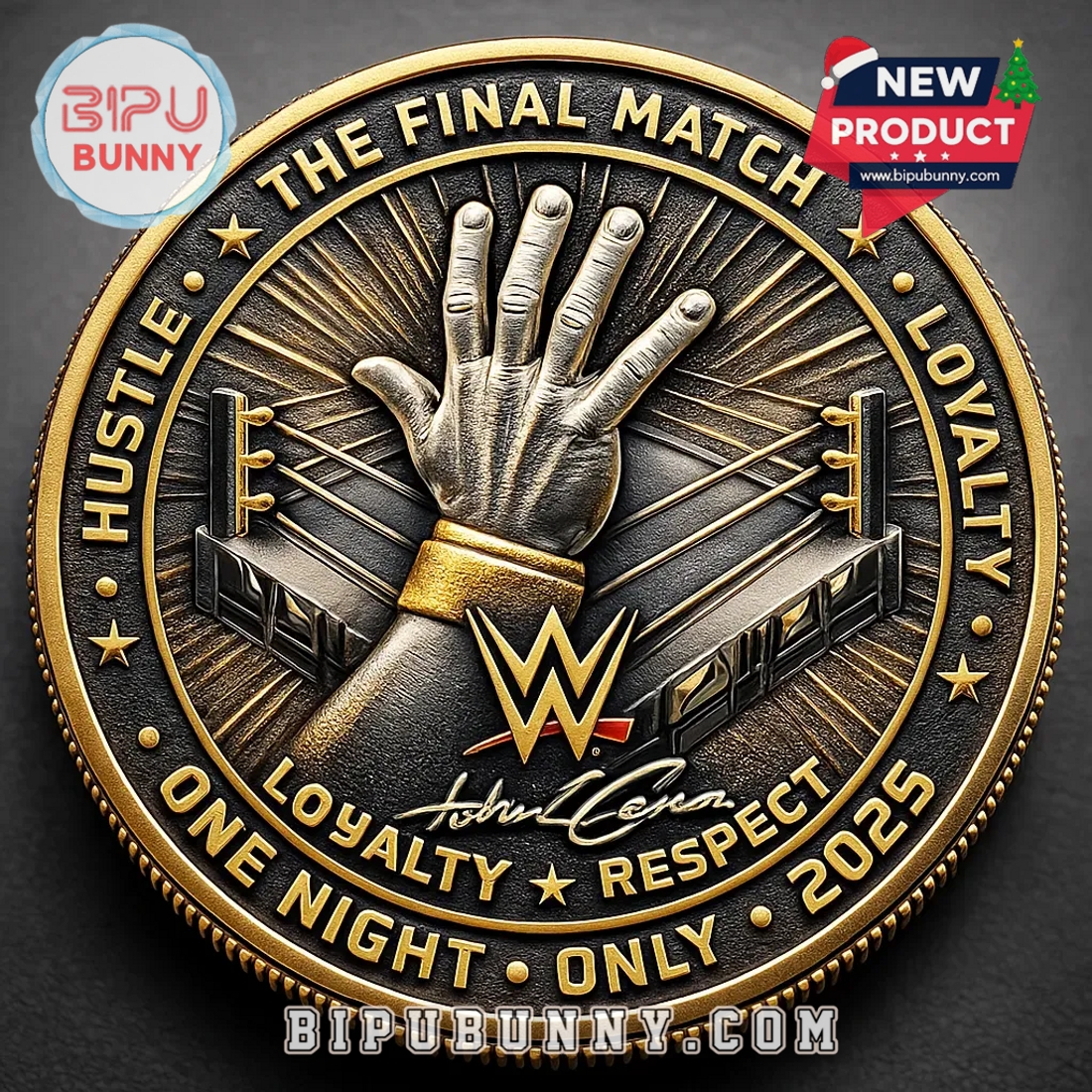 Around the edge of the coin, the bold phrase “NEVER GIVE UP” is pressed in raised letters, while the bottom highlights the timeline “2002 – 2025” in a polished font. On the reverse, the design features a striking WWE Championship Belt, centered proudly with realistic texturing and fine line detailing. Below it, each coin is individually numbered (No. 001 / 1000) to reinforce its exclusivity. A second style highlights Cena’s Final Match with a raised ring design, spotlight lighting, and Cena’s signature above the WWE logo—making it perfect for fans of milestone moments. Though small, these coins pack in subtle textures—like the ribbed edges, glinting finish, and micro-etching of the turnbuckles—that make them feel premium in every way.