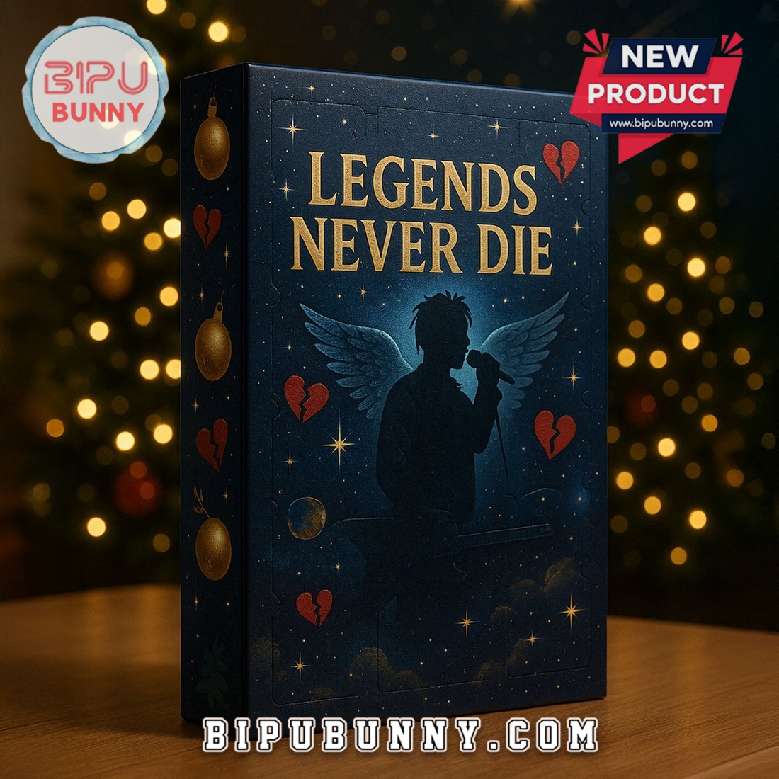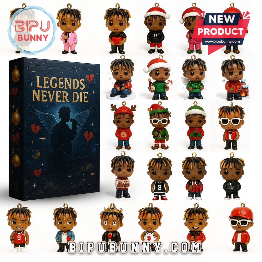 The Juice WRLD Advent Calendar 2025 is more than a holiday tradition—it’s a heartfelt tribute. Designed with a deep midnight blue background, the box features a silhouette of Juice WRLD with angel wings, surrounded by gold ornaments, stars, and subtle broken-heart icons. The phrase “Legends Never Die” appears in bold metallic gold letters, instantly catching the eye. Inside, there are 24 hidden compartments, each revealing a different mini Juice WRLD figure, measuring about 2 inches tall, made from durable, thick acrylic (3–4mm).
