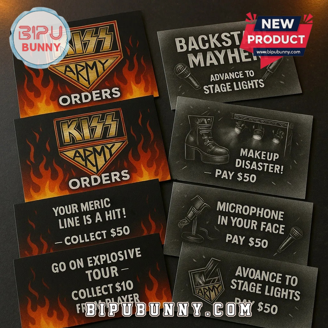 - Kiss-themed money and cards: Play with custom Kiss Cash, featuring iconic images of the band.-