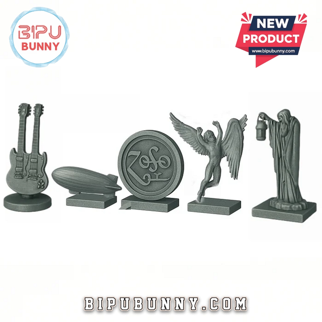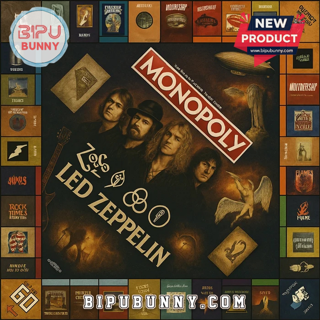 The Led Zeppelin Monopoly Board Game brings the legendary rock band to life in a vibrant, collectible edition of the classic Monopoly game. Featuring the bold and energetic colors of red, black, and gold, the box artwork includes iconic images of the band members, instantly setting the tone for a musical adventure. The game board is filled with Led Zeppelin album covers and concert moments, with properties that represent the band’s historic songs and albums. The pieces are specially designed, including tokens inspired by Led Zeppelin’s iconic symbols like the Zeppelin blimp, a guitar, and the band’s famous logo. The game features custom money designed with Led Zeppelin branding and colors, making the entire experience feel like stepping into the band’s world. Additionally, Back Tracks spaces allow players to buy and trade iconic albums, adding a musical element to the traditional Monopoly gameplay. The design is both sleek and bold, capturing the essence of the rock band while keeping the gameplay fun and fast-paced for players of all ages.