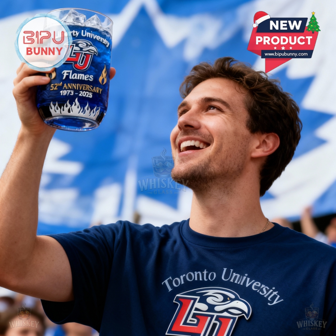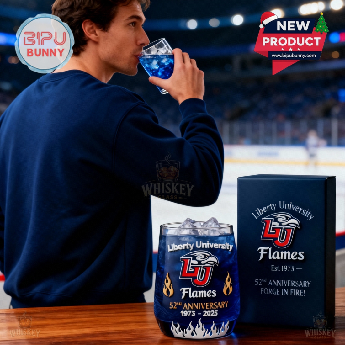 This whiskey glass is made from clear, thick glass that feels solid and balanced the moment you pick it up. The body features a deep blue tone that looks especially striking when filled with ice or a clear drink, creating a cool contrast to the warm flame details. At the center front is the Liberty University LU Flames logo, printed clearly in red white and navy so it remains easy to see even when the glass is full. Just below the logo, the text 52nd Anniversary 1973 to 2025 marks the milestone in a clean and readable layout.