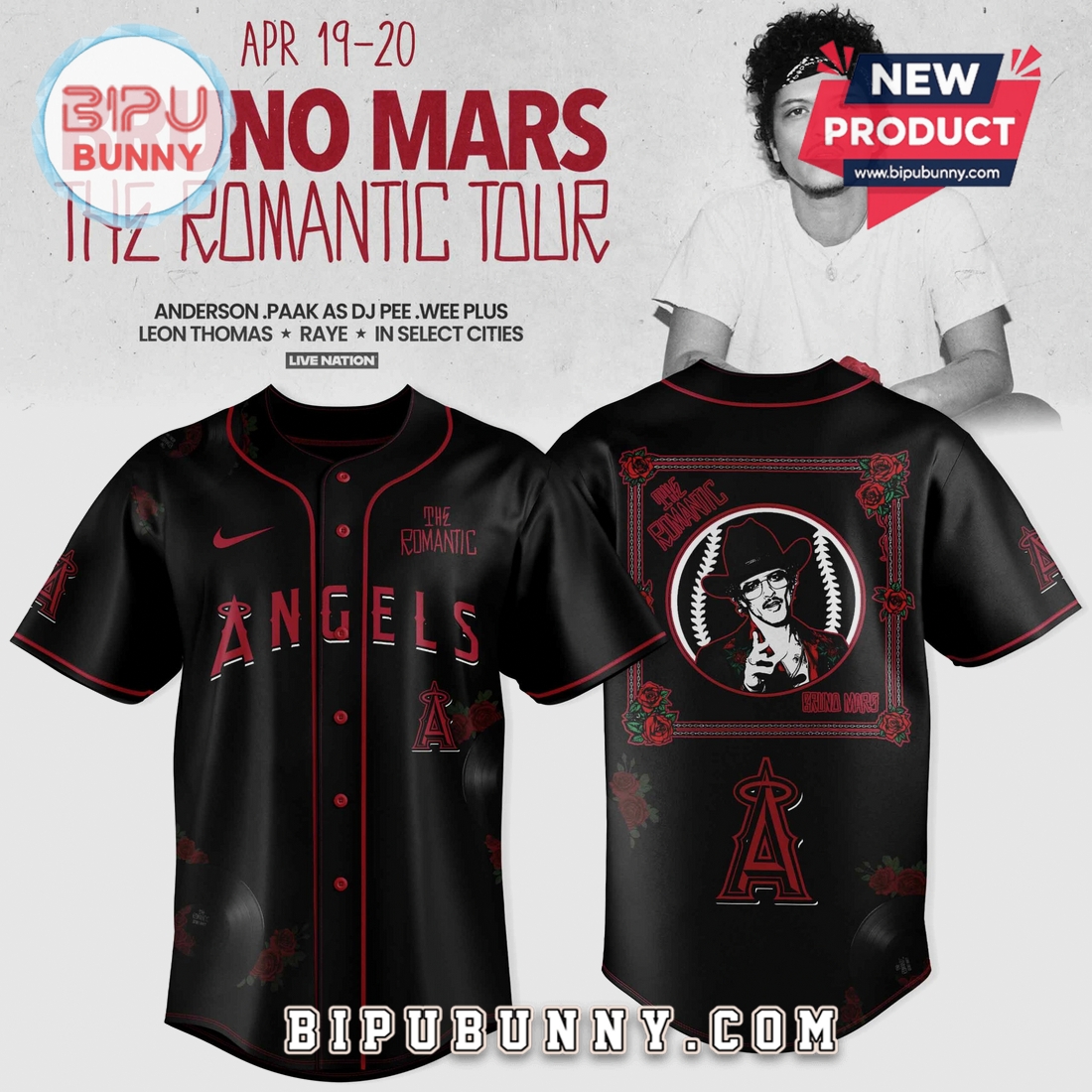 Sport the ultimate fan gear: Los Angeles Angels meets Bruno Mars ‘The Romantic Tour’ in this exclusive black baseball jersey. Stand out.