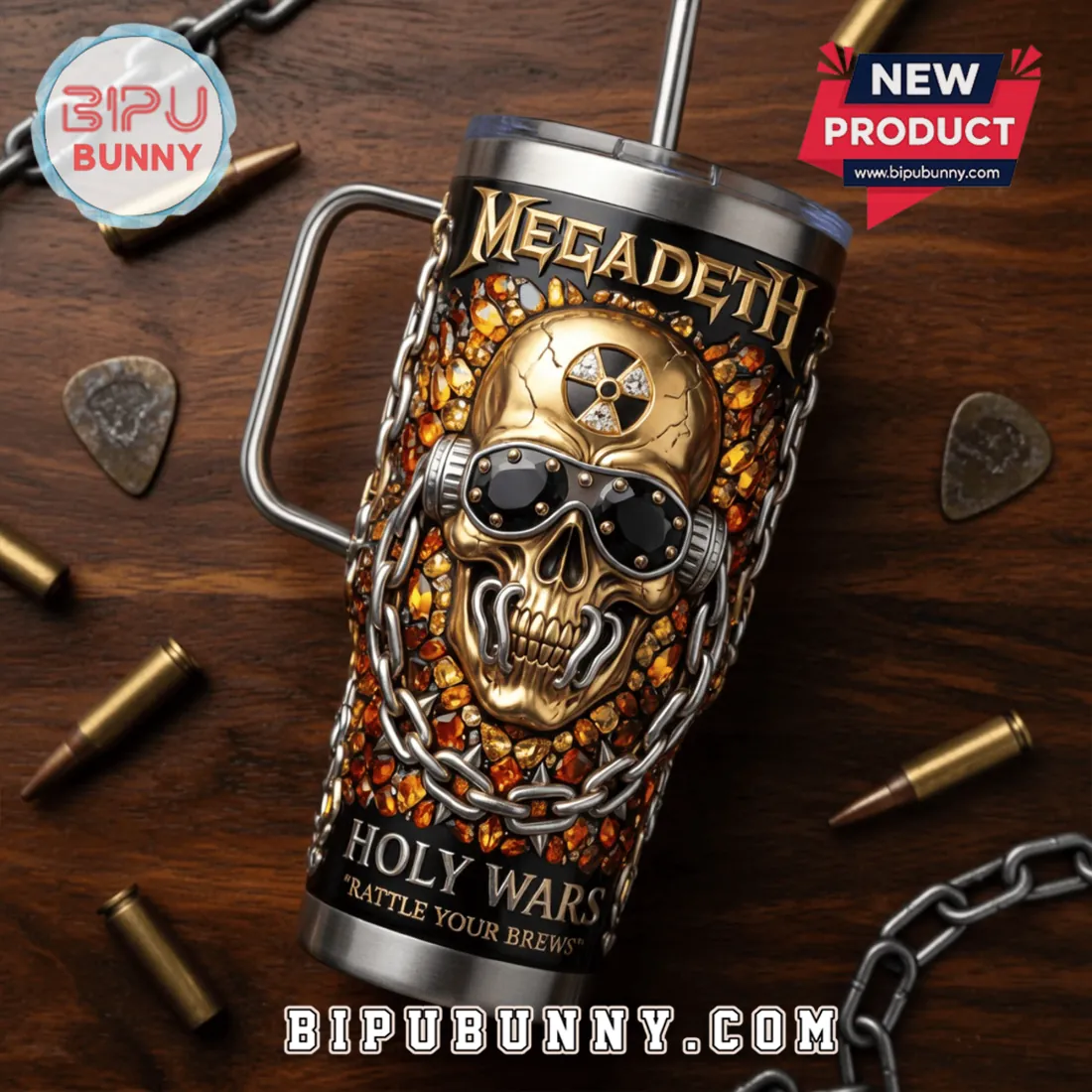 This Megadeth Holy Wars 3D Embossed Gold Skull Stanley Tumbler is for the steadfast few, the true believers who stand by their metal roots, forever loyal to the sound that defines them.