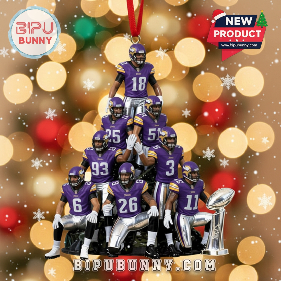 The Minnesota Vikings Christmas Ornament 2025 is a must-have for fans who want their holiday décor to reflect true team spirit. This eye-catching ornament features a pyramid of miniature football players dressed in the Vikings’ iconic purple and silver uniforms, complete with accurate jersey numbers and helmet logos. The figures are posed in a powerful team formation, standing shoulder to shoulder and hand to hand, with player number 18 proudly placed at the top.